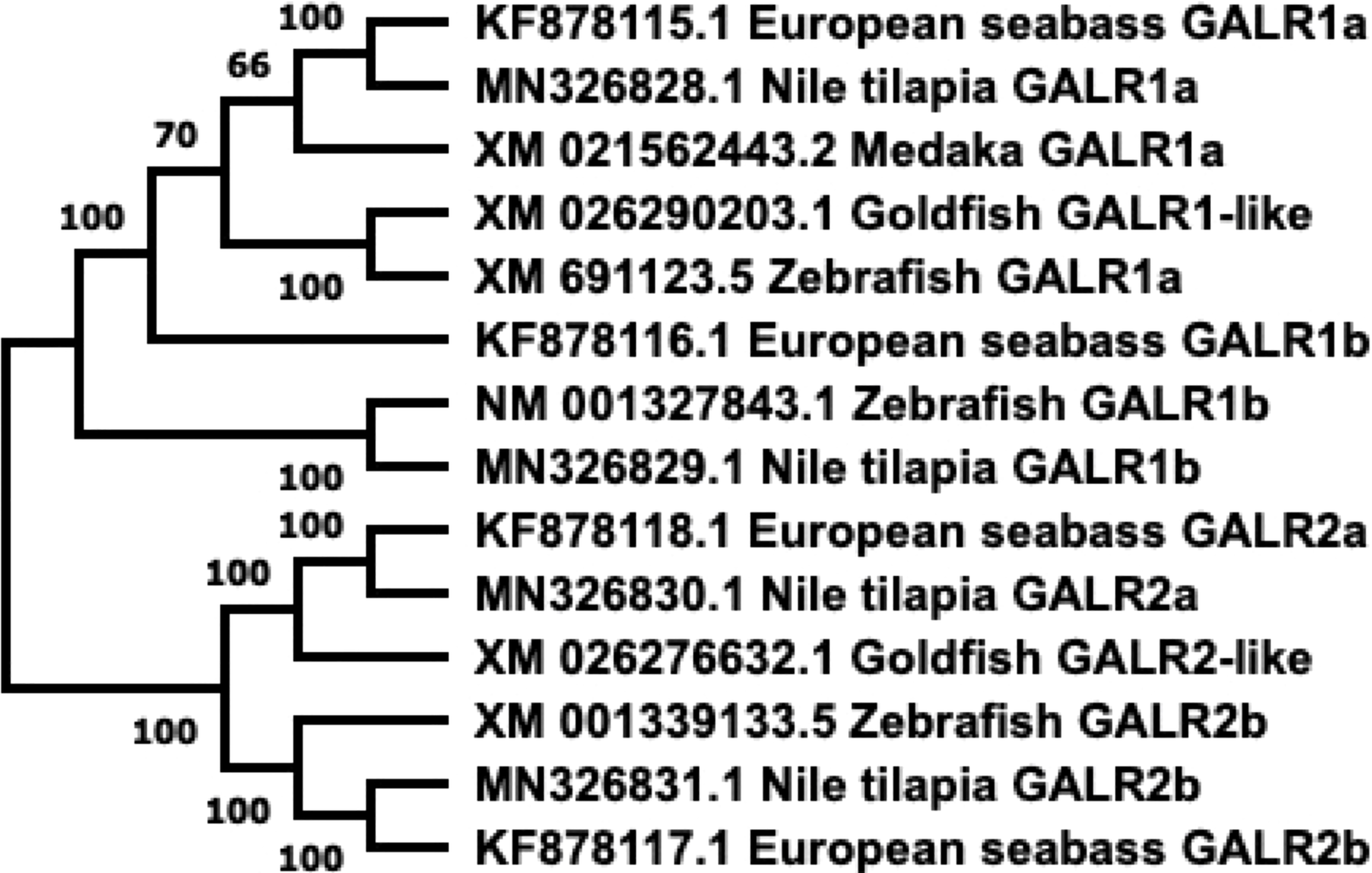 Phylogenetic tree of GALRs present in fish. Sequences obtained from GenBank. Phylogenetic construction was done in MEGA X, using the Neighbor-Joining method. The percentage of the sequences clustered together is shown on the branches, out of 1000 boots. GALR1 and GALR2 form distinct branches.