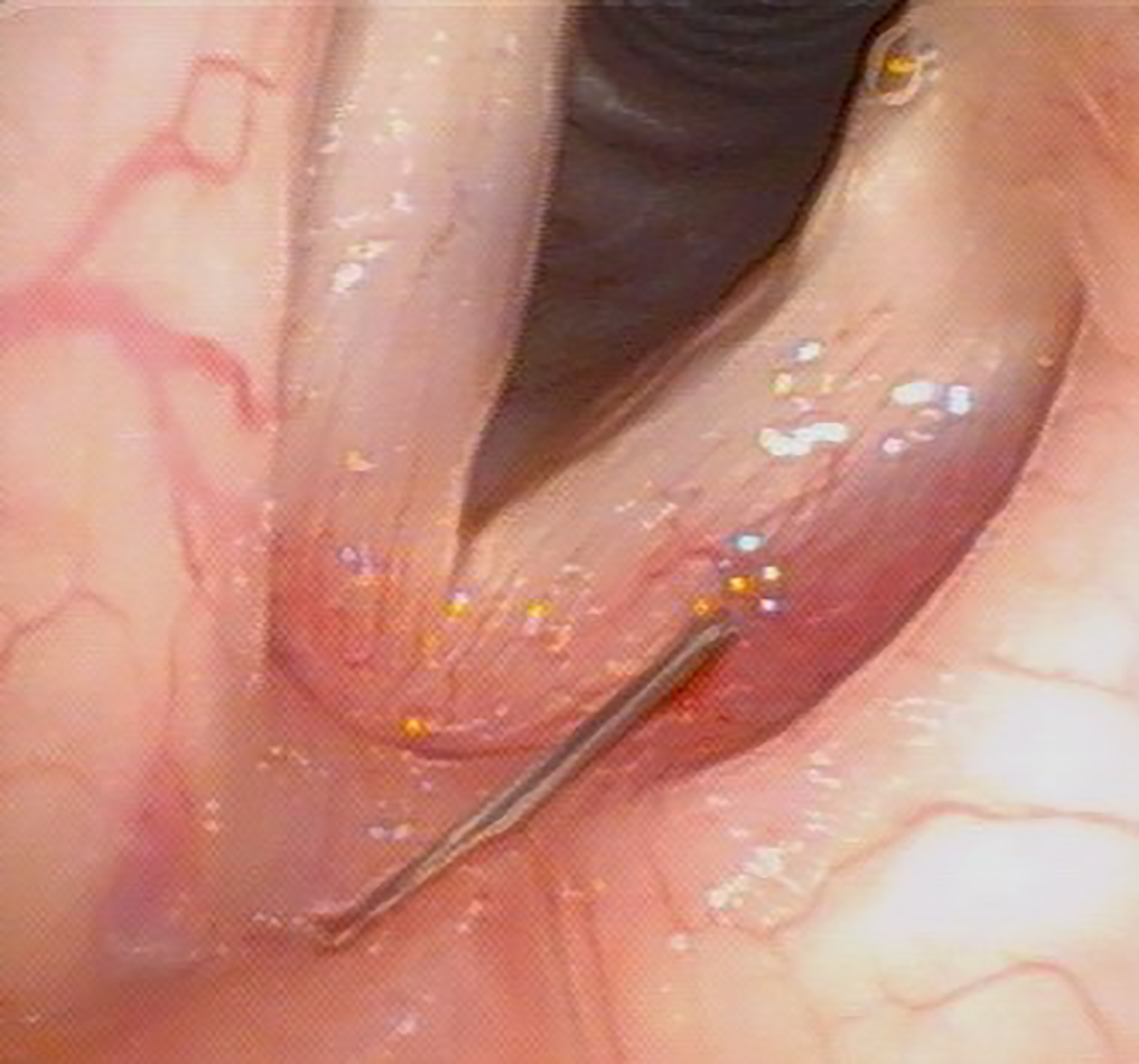 We performed FI under general anesthesia. Autologous fat was obtained from the lower abdomen through liposuction via a small peri-umbilical incision. After infiltrating tumescent solution, we aspirated 10 to 20  mL of subcutaneous adipose tissue. We further rinsed the fat tissue with normal saline to remove blood clots, and the purified fat globules were loaded into a 1-cc insulin syringe. The autologous fat was then injected into vocal folds under the guidance of a direct suspension laryngoscope (Figure 3), and the target area was the posterior third of the vocalis muscle, just lateral to the vocal process. To compensate for fat loss or reabsorption, we generally overinjected 20% to 30% of the fat (23).