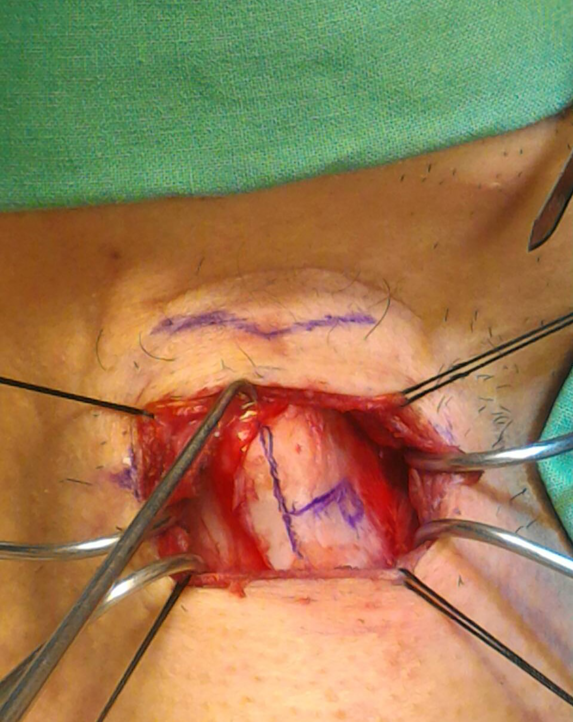 All the MT procedures were performed under local anesthesia combined with light intravenous sedation. A horizontal skin incision was made at the level of the mid-height of the thyroid cartilage. After we elevated the platysma and retracted the strap muscle, the thyroid cartilage was exposed. The thyrotomy window was created 3–4 mm above the lower margin of the thyroid cartilage, 6–8 mm lateral to the midline of the thyroid cartilage (Figure 4). The window was approximately 3–4 mm high and 5–8 mm wide depending on the size of the thyroid cartilage (24). We inserted a Gore-Tex sheet to medialize the paralytic vocal fold, and adjusted the depth of medialization according to auditory feedback by asking the patient to phonate intra-operatively. Once the voice quality was tuned, the implant was sutured to the thyrotomy window and closed using a small piece of bone wax. After careful hemostasis, the wound was closed in layers without the need to place a drain.
