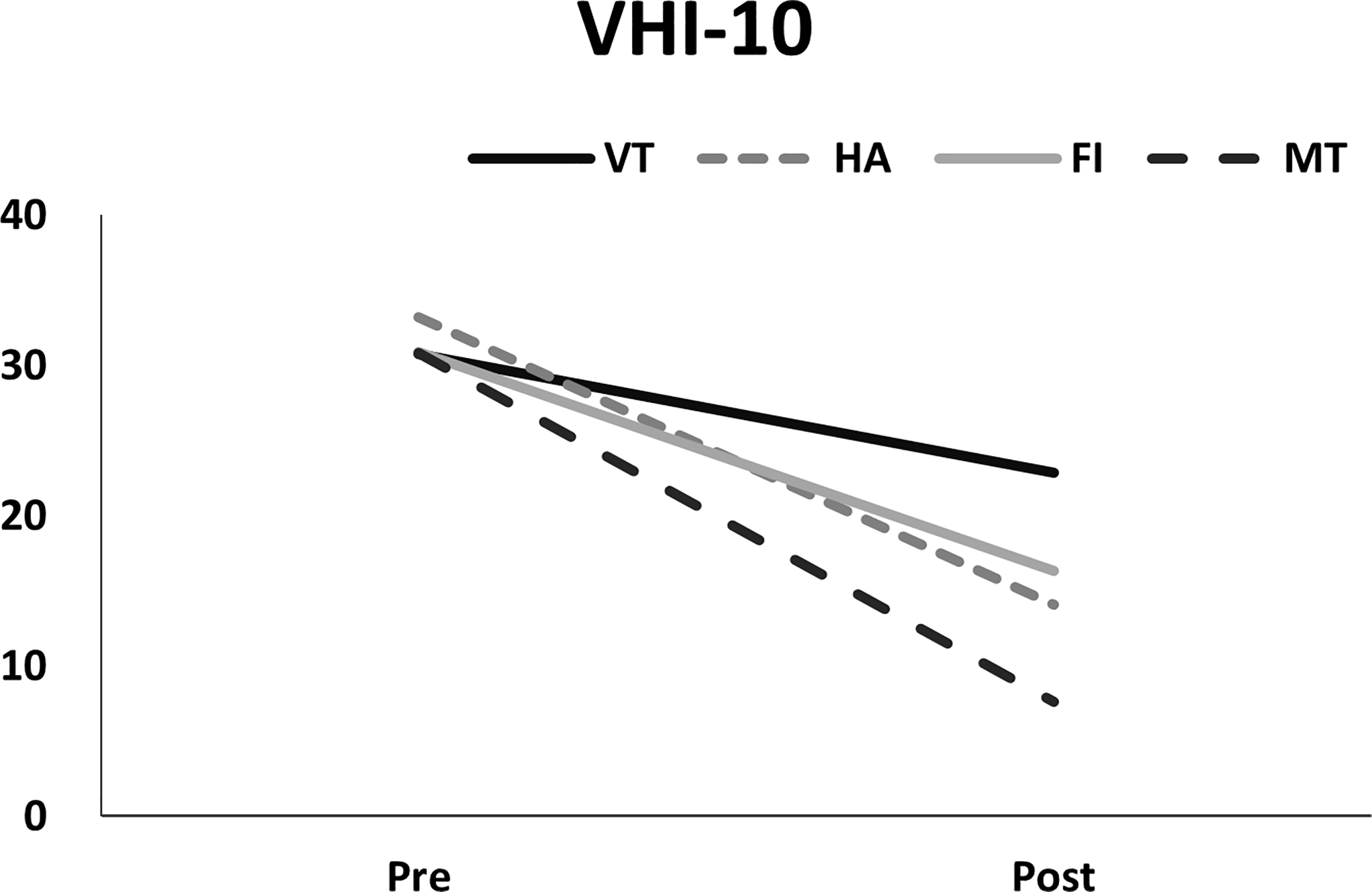 Pre- and post-measurements of VHI-10 in different treatment groups.