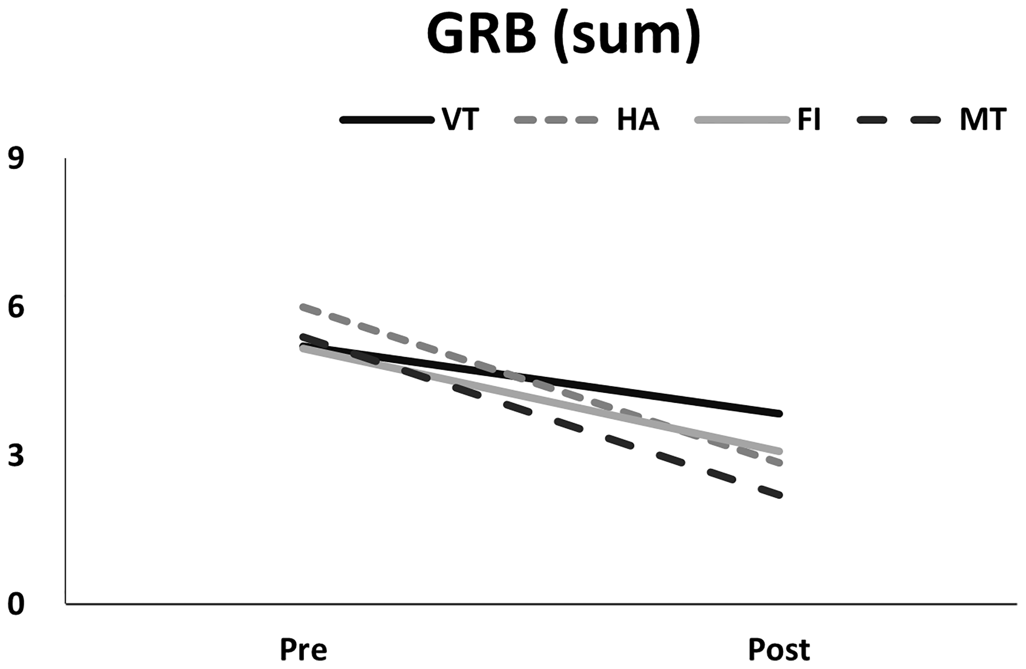 Pre- and post-measurements of the summation of GRB scores in different treatment groups.
