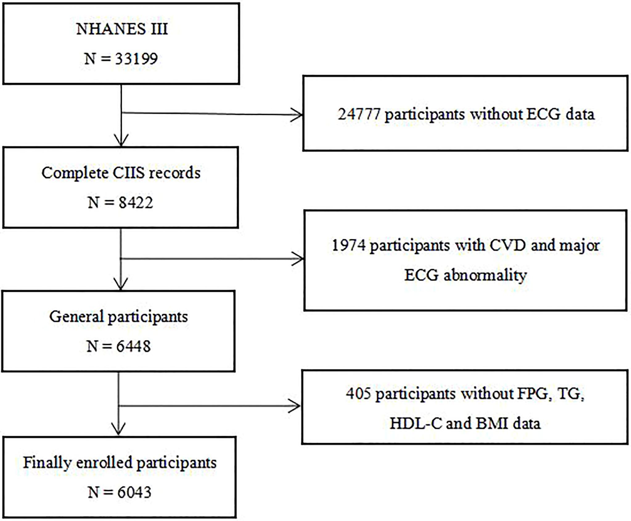 All participants in this study came from a national survey aimed at investigating the nutritional and health status of children and adults in the United States, namely the third National Health and Nutrition Examination Survey (NHANES III). After excluding individuals with CVD, major ECG abnormalities and absence of TG, FPG, HDL-C, BMI and CIIS data, 6043 individuals were finally enrolled in our study (Figure 1). Individuals in this study have provided written informed consent, and the study scheme was approved by the National Center for Health Statistics of the Center for Disease Control and Prevention Institutional Review Board and in line with the basic principles of the Declaration of Helsinki.