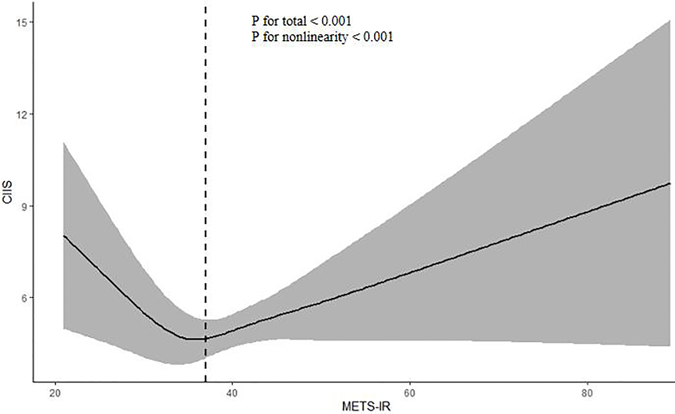 Restricted cubic spline plot of the association between METS-IR and CIIS. The association was adjusted for variables included in Model 4. METS-IR metabolic score for insulin resistance, CIIS cardiac infarction/injury score.