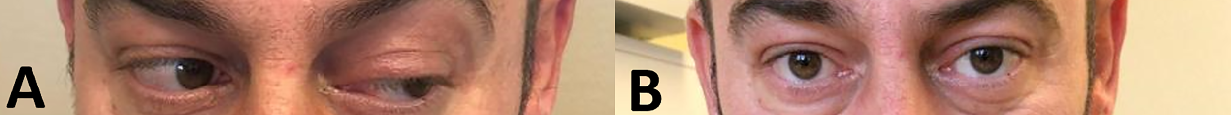 (A) Preoperative photo showing left oculomotor palsy with partial ptosis and exaggerated abduction with downward deviation due to unopposed action of trochlear and abducens nerves. (B) Post-operative photo showing complete recovery of the left ptosis.