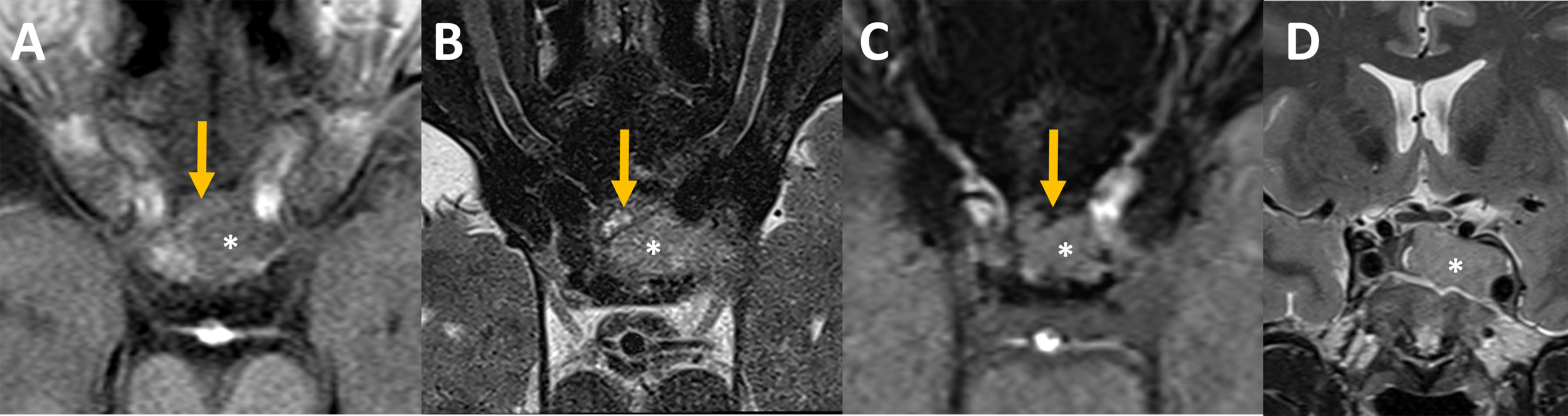 Pre-operative MRI Axial MR imaging focused on the sella at admission (A–C): The intra-sellar lesion (star) was heterogeneous on its anterior aspect. Some bloody components (orange arrows) that appeared slightly hyperintense on unenhanced T1 (A), hyperintense with an hypointense rim on T2 spin echo (B) and hypointense on susceptibility weighted images, SWI, (C) were intercalated between the bone and the rest of the lesion. (D) Coronal MR imaging showed pituitary adenoma with invasion of the left cavernous sinus, grade 3b according to Knosp classification (17).