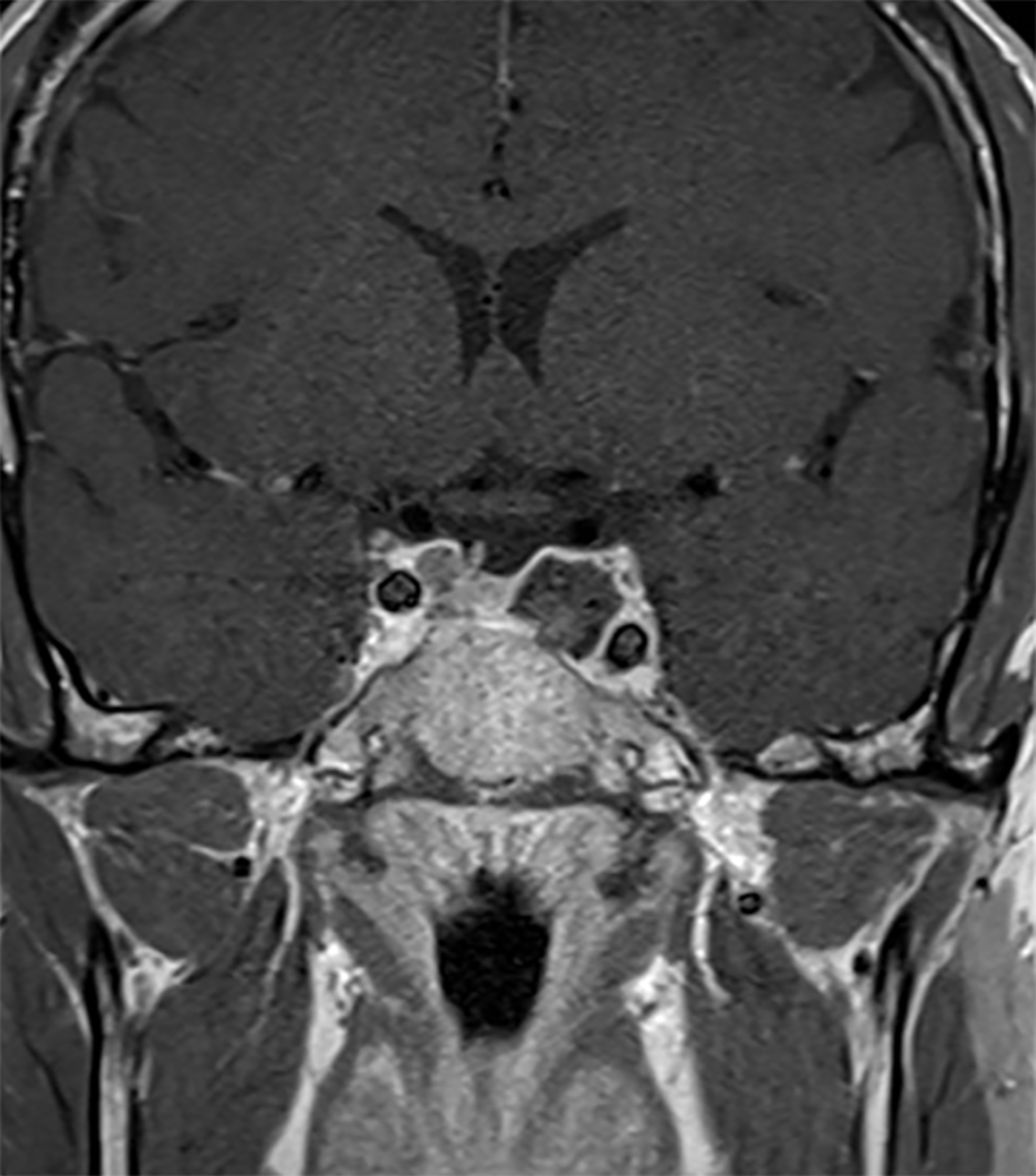 The patient was then operated using an endoscopic endonasal transsphenoidal approach to remove the tumor and decompress the structures inside the cavernous sinus (19). Intraoperatively, we found hemorrhagic areas and blood clots inside the tumor which confirmed the diagnosis of apoplexy. Histopathological analysis revealed the presence of a clinically silent sparsely granulated corticotroph adenoma. There was no hormonal co-expression detected. Post-operatively, third cranial nerve palsy resolved Figure 1. His post-operative work-up showed mild/moderate corticotrope deficiency and the patient was temporarily substituted with hydrocortisone. Subsequent pituitary retesting at 6 weeks post surgery confirmed normalized corticotrope function (ACTH-stimulation testing) and reversal of the hypogonadotropic profile in the presence of normal testosterone levels Table 1. Immediate postoperative MRI showed no residual tumor Figure 3. Given the absence of residual tumor, we did not perform a screening for subclinical hypercortisolism (such as a low-dose dexamethasone suppression test) after the surgery. Serial monitoring of cortisol and ACTH levels is scheduled.