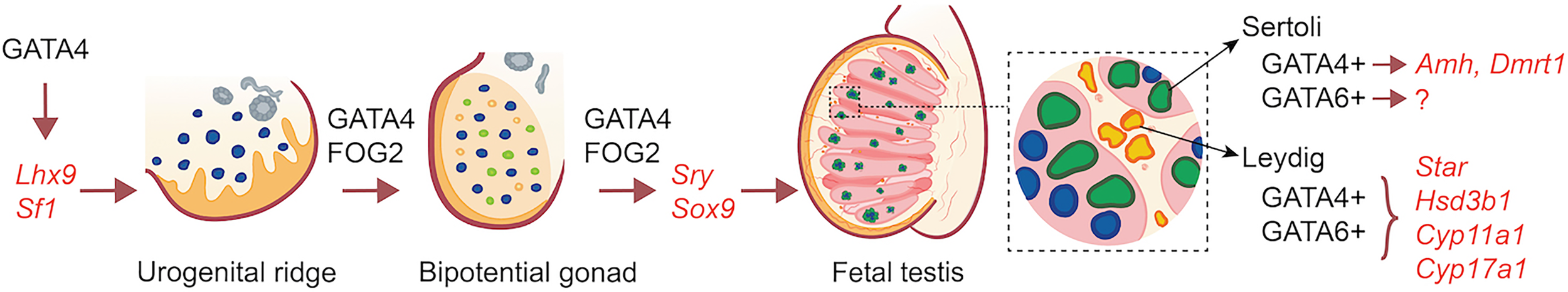 GATA factors are incontrovertibly essential regulators of developmental and functional processes in multiple organs systems. The mammalian testis is no exception where at least three GATA factors (1/4/6) play essential, and sometimes overlapping roles, in controlling the initiation of male gonad development, testis differentiation at the time of sex differentiation, and gene expression and function in both the fetal and mature testis (an illustrative overview in presented in Figure 1). Over the years, much of our knowledge of the mechanisms of GATA action in the testis have come from genetic manipulation of the different Gata genes in mice and the analysis of the cis-regulatory regions of many of its proposed target genes in cell lines. From this point forward, the challenge will be to fine-tune this knowledge base by ascertaining not only what testis genes are regulated by GATA factors but more so, by identifying the genes that are directly targeted by these factors. The recent development and applicability of new technologies has made this a reality as we are now capable of probing the role of individual cis-regulatory elements in suspected genes by genome editing. Therefore, understanding GATA function in the testis is far from complete, but rather has just begun.