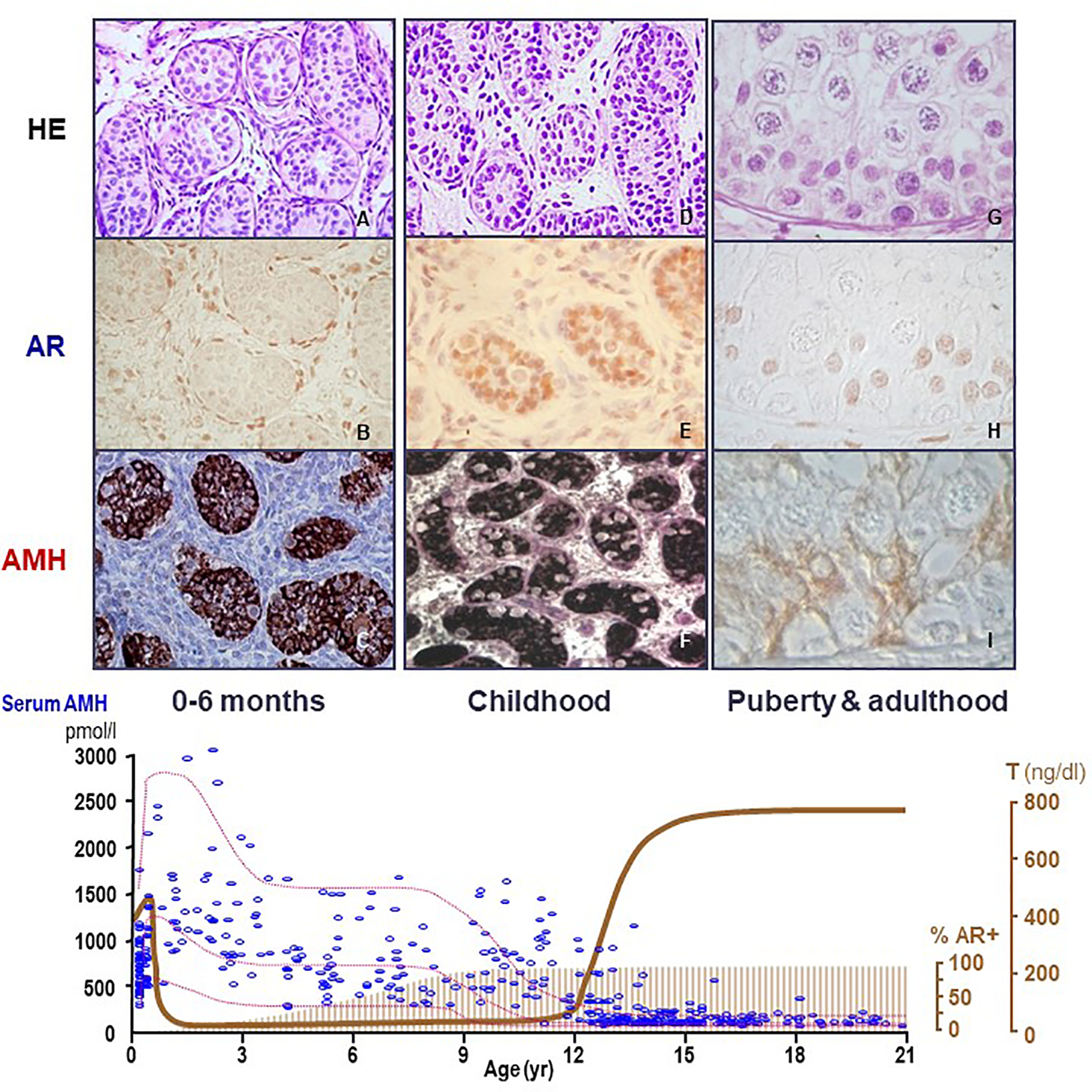 Relationship between AMH production, androgen receptor (AR) expression and androgen levels in the human testis. During the postnatal period of activation of the hypothalamic-pituitary-testicular axis (0-6 months, first column, A–C), testosterone (T) levels are high (bottom graph, serum hormone levels); however, Sertoli cells do not show maturational changes because they do not express the AR (upper graph, second line, immunohistochemistry). Therefore, AMH expression is high (upper graph, third line, AMH immunohistochemistry) and germ cells do not enter meiosis (upper graph, first line, HE: hematoxylin-eosin staining). During the “quiescent” period of the gonadal axis (childhood, second column, D–F), androgen synthesis is negligible, which explains why Sertoli cells remain immature even though they have started to express the AR. In puberty and adulthood (third column, G–I), T increases, inducing Sertoli cell maturation, reflected in the decline of AMH expression and the onset of adult spermatogenesis. Bottom graph shows % AR+: percentage of Sertoli cells expressing the AR. AMH (pmol/l) and T (ng/dl): schematic representation of AMH and T serum levels from birth to adulthood in males.