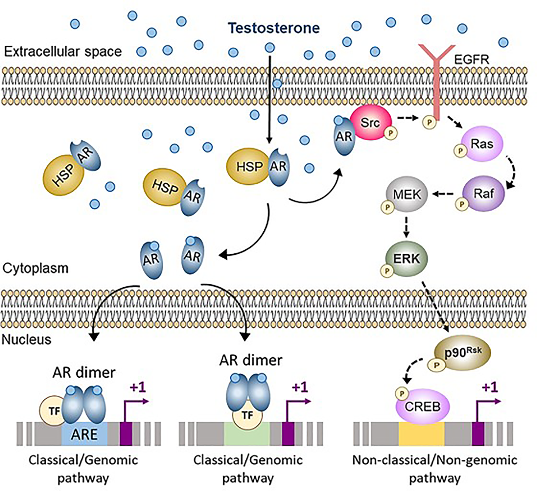 Androgen signaling in target cells typically occurs through the AR engaging either the classical (or genomic) or the non-classical (or non-genomic) pathways (Figure 3) (73). The classical pathway involves the intracellular AR acting as a transcription factor. In the inactive state, the AR is bound to cytoplasmic heat-shock proteins. When testosterone or the more potent and non-aromatizable androgen dihydrotestosterone (DHT) binds to the AR, a conformational change leads to the release of the AR from the heat-shock proteins, AR phosphorylation, homodimer formation, nuclear translocation and interaction with androgen response elements (ARE), specific DNA sequences in the regulatory regions of target genes (18). Typical ARE are palindromic: in humans, the consensus sequence is 5’-AGAACAnnnTGTTCT-3’ (74). The androgen-bound AR can also regulate target gene expression in the absence of ARE, by interacting with trans-activating factors that bind to their specific binding sequences (75). Androgen signaling through the genomic pathway requires 30-45 minutes to induce transcriptional regulation (76).