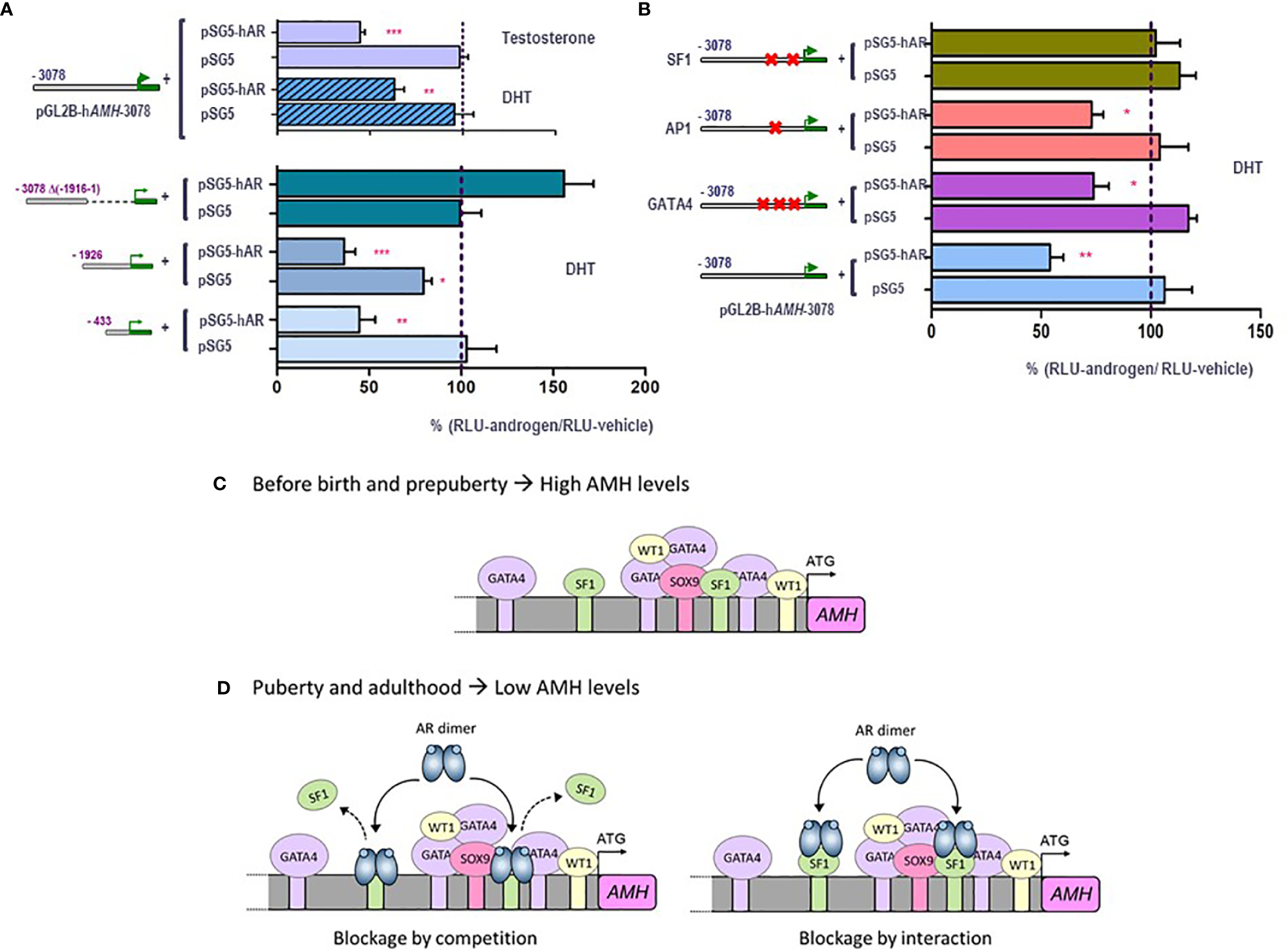 Molecular mechanisms involved in androgen-induced downregulation of AMH expression in Sertoli cells. A and B: luciferase assays in SMAT1 Sertoli cells transfected with a luciferase plasmid under control of the human AMH promoter (pGL2B-hAMH) of different lengths and co-transfected with an expression plasmid of the androgen receptor (pSG5-AR) or pSG5 devoid of the AR. Cells were exposed to testosterone or DHT 10-7 M, or vehicle, and results were expressed as relative luciferase units (RLU) comparing cells exposed to androgens and those exposed to vehicle (* p<0.05, ** p<0.01, *** p<0.001). A 100% level indicates the basal AMH promoter activity. Testosterone and DHT induce an inhibition of AMH promoter activity when the AR is present but not in its absence, when 433 to 3076 bp of the promoter are present but not when the proximal 1916-bp sequences are lacking (A). The inhibition induced by androgen persists even if the binding sites for AP1 or GATA4 are mutated, but not when SF1 sites are mutated (B). (C, D) schematic of androgen regulation of AMH expression. In fetal and postnatal periods before the onset of puberty, the lack of androgen action allows the AMH promoter activity induced by SOX9, SF1 and GATA4, resulting in high AMH production. During puberty and adulthood, the steroid-bound AR represses AMH promoter activity by competition or by interaction with SF1. Modified with permission from Edelsztein et al. (80) © 2018 The Authors and Edelsztein and Rey (18) © 2019 The Authors.