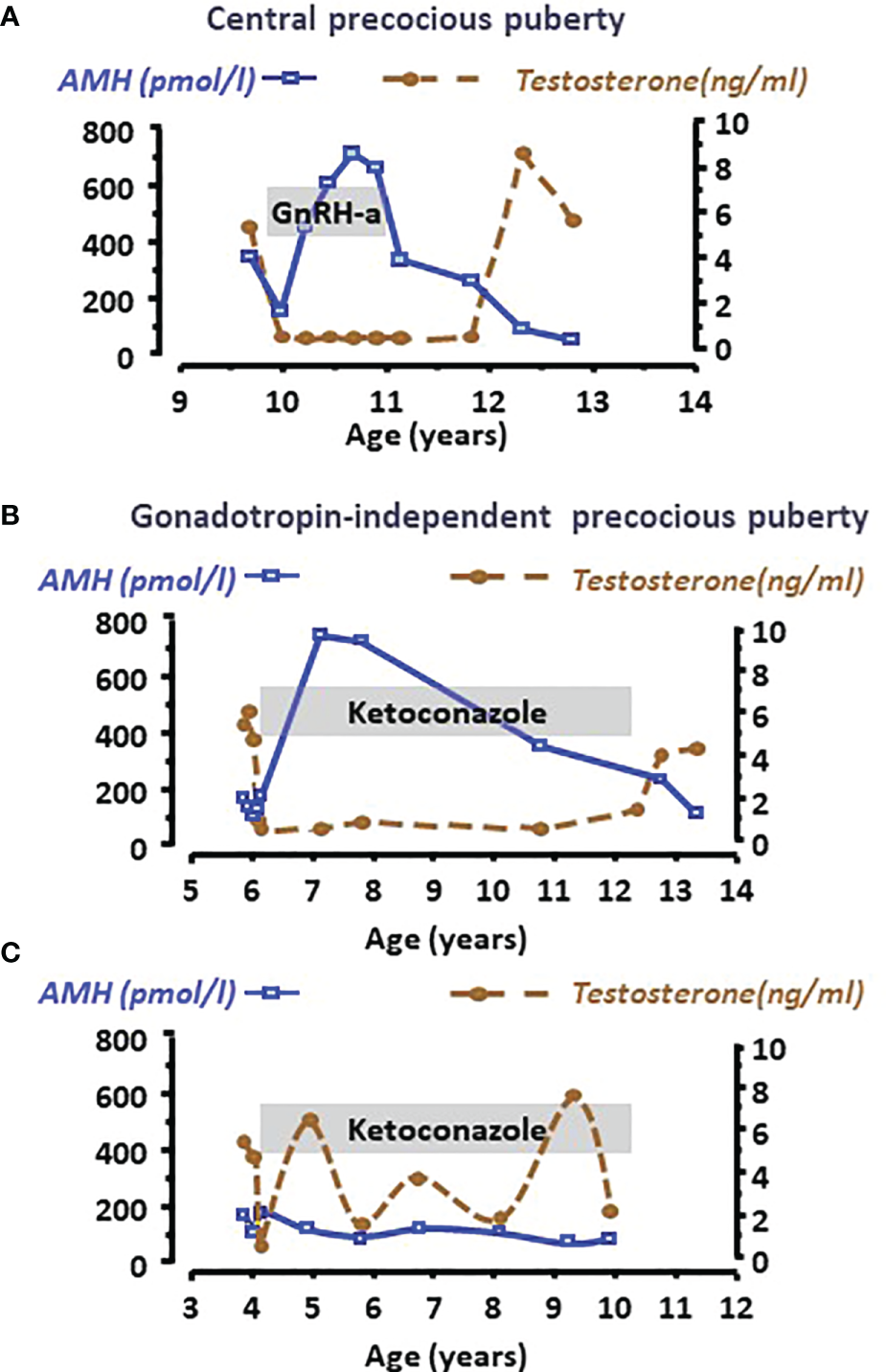 Clinical studies have shown that AMH decline is not merely associated with chronological age but rather with the maturation status of the testes. Indeed, a decrease in serum AMH is an early sign of an increase in intratesticular testosterone concentration reflecting the activation of LH pulses occurring with pubertal onset. The decrease in serum AMH occurs already in Tanner 2 stage of puberty in boys, that is earlier than the increase in serum testosterone, taking place in Tanner 3 stage (24, 48, 81, 82). Furthermore, AMH is low for age in boys aged 2 to 8 years with precocious puberty, independently of gonadotrophin levels, and recovers prepubertal levels when testosterone production is effectively curtailed by treatment (Figures 5A, B) (48, 68). Serum AMH can be used as a marker of effective treatment. In fact, for Sertoli cells to resume their prepubertal status and increase AMH production, intratesticular androgen levels should remain continuously low for at least 6 months. If adherence to treatment is erratic and intratesticular testosterone concentration shows intermittent variations, serum AMH never increases to prepubertal levels (Figure 5C) (48).