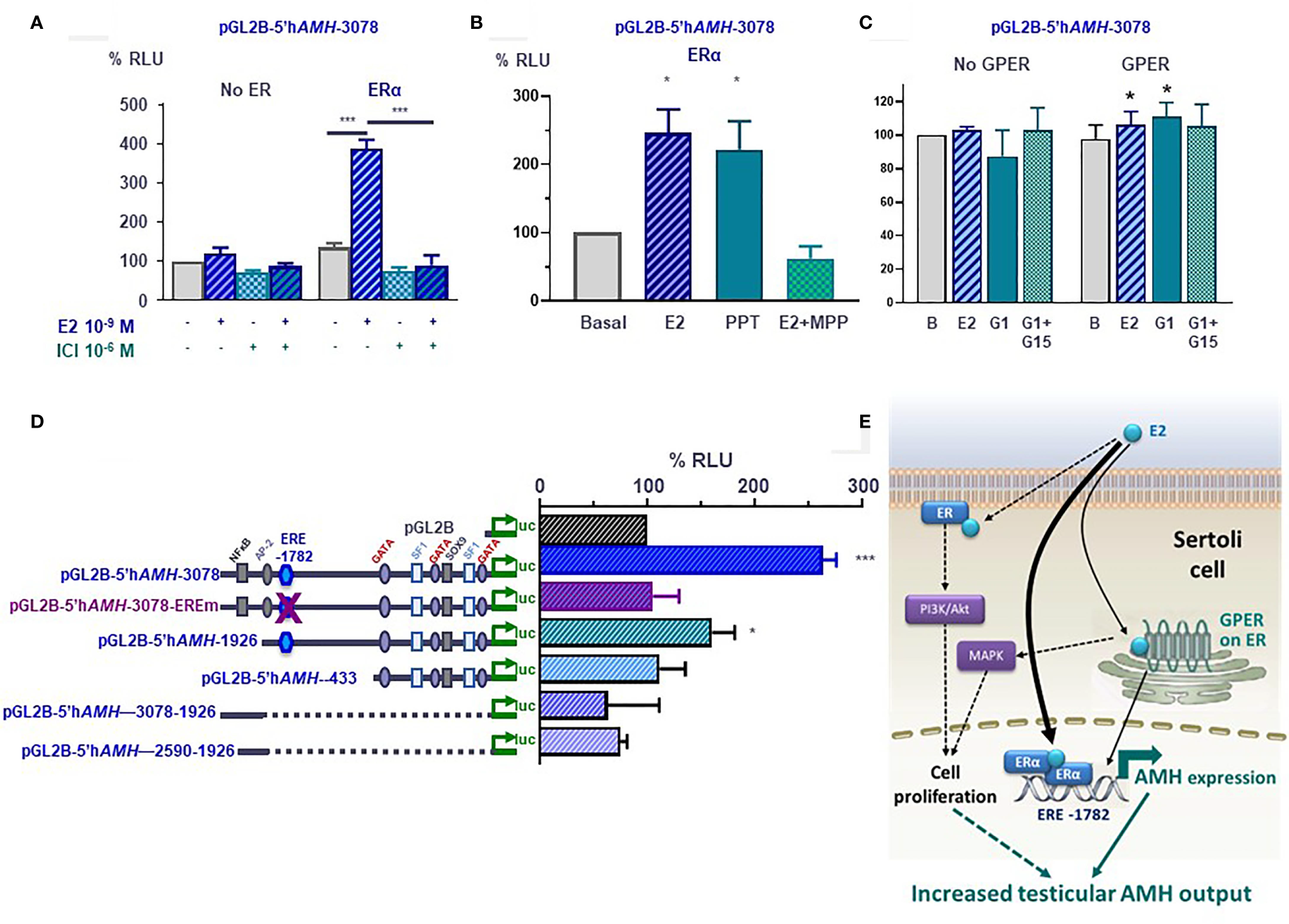 Molecular mechanisms involved in estrogen-induced upregulation of AMH expression in Sertoli cells. (A–D) Luciferase assays in SMAT1 Sertoli cells transfected with a luciferase plasmid under control of the human AMH promoter (pGL2B-hAMH) of different lengths and co-transfected with an expression plasmid of the estrogen receptor alfa (ERα) or the G protein-coupled estrogen receptor (GPER) or the control plasmids devoid of the estrogen receptor sequences. Cells were exposed to estradiol (E2), the ERα/β antagonist ICI 182780, the ERα-specific agonist PPT or antagonist MPP, or the GPER-specific agonist G1 or antagonist G15. Results were expressed as relative luciferase units (RLU) comparing cells exposed to estrogens, agonists and/or antagonists (* p<0.05, *** p<0.001). A 100% level indicates the basal AMH promoter activity. E2 induce an upregulation of AMH promoter activity when the ERα or the GPER is present but not in their absence (A–C), and when the estrogen response element (ERE) at -1782 of the promoter is conserved (D). (E) Proposed model for E2 regulation of AMH expression in Sertoli cells. E2 upregulates AMH transcription via ERα binding to the ERE. GPER also upregulates AMH expression more modestly. The increased AMH expression results in a higher testicular AMH production. Another potential mechanism is the increase in Sertoli cell proliferation induced by membrane-bound ERα signaling through the PI3K/Akt pathway, and/or GPER via MAPK signaling. Reproduced with permission from Valeri et al. (19)© 2020 The Authors.