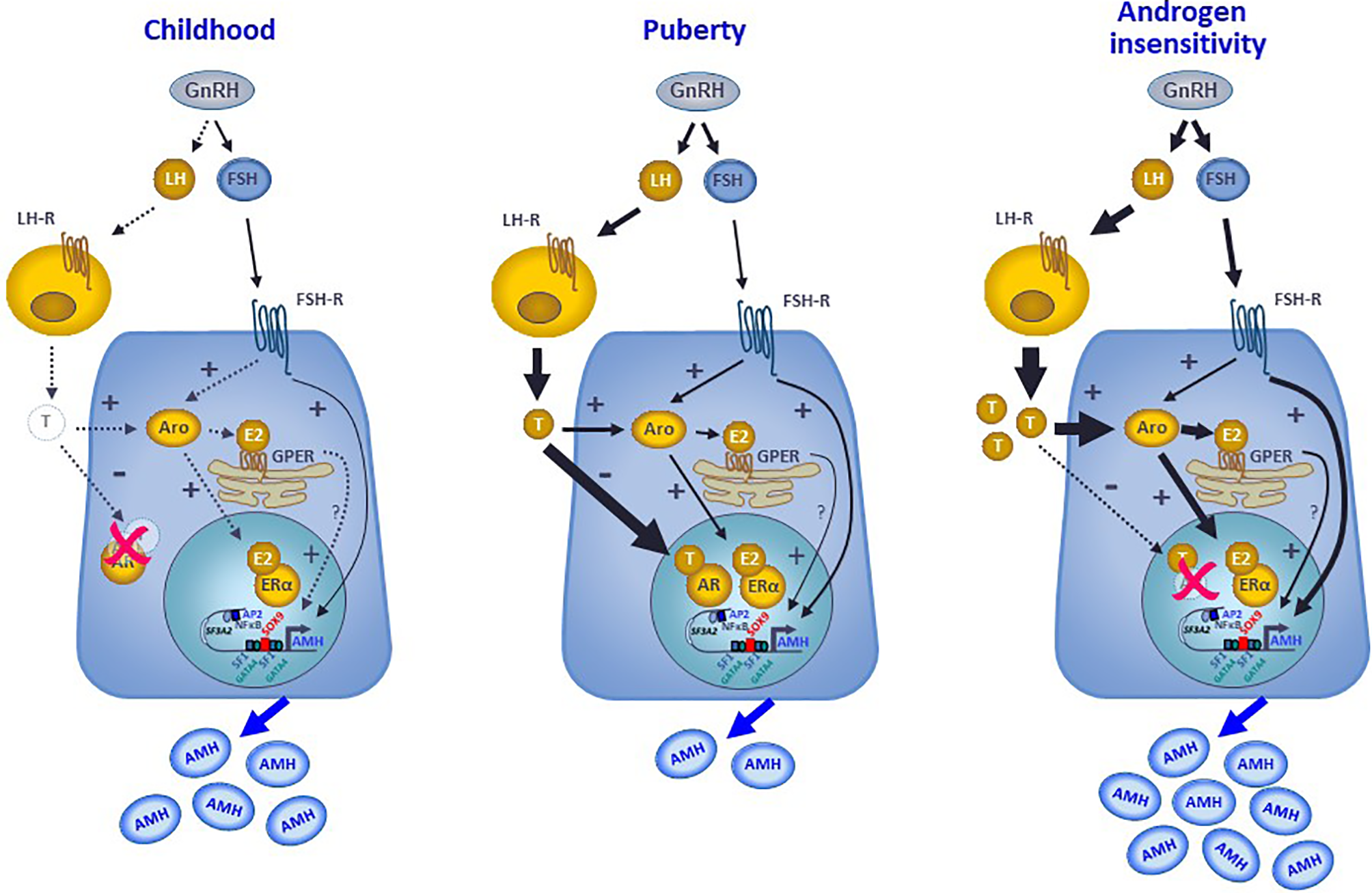 Interaction between androgens, estrogens and FSH on the regulation of AMH expression in Sertoli cells. During childhood, the hypothalamic-pituitary-gonadal axis is quiescent, and the extremely low steroid levels do not exert any physiological regulation on AMH production that is mostly hormone-independent. At puberty, the reactivation of the GnRH neuron and the gonadotropes result in higher LH and FSH levels. LH induces testosterone secretion by testicular Leydig cells. FSH acts on its receptor in the Sertoli cell membrane, resulting in a direct upregulation of AMH expression, through the cyclic AMP-PKA pathway involving transcription factors SOX9, SF1, AP2 and NFκB, and in an indirect upregulation of AMH by inducing aromatase expression. Aromatase converts androgens into estrogens, which can upregulate AMH directly by binding to the nuclear ERα or indirectly acting through the GPER expressed in the membrane of the endoplasmic reticulum. Nonetheless, the inhibitory effect of androgens overrides the stimulatory effect of FSH and estrogens on AMH expression, resulting in a decreased AMH secretion. In hyperestrogenic states with abrogated androgen action, such as the androgen insensitivity syndrome, the inhibitory effect of androgens does not exist, FSH and LH increase resulting in high testosterone that is converted to estradiol. Consequently, AMH production is substantially boosted.