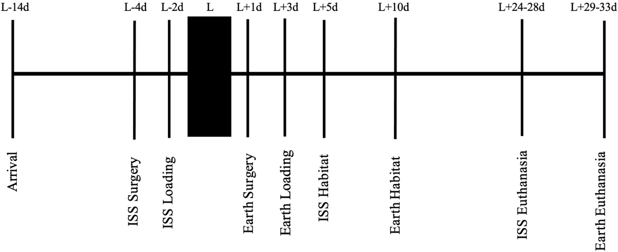 A stepwise representation of the experimental timeline, starting with mouse acclimation, to spaceflight launch, and ending with euthanasia. L, launch; d, day; ISS, International Space Station.