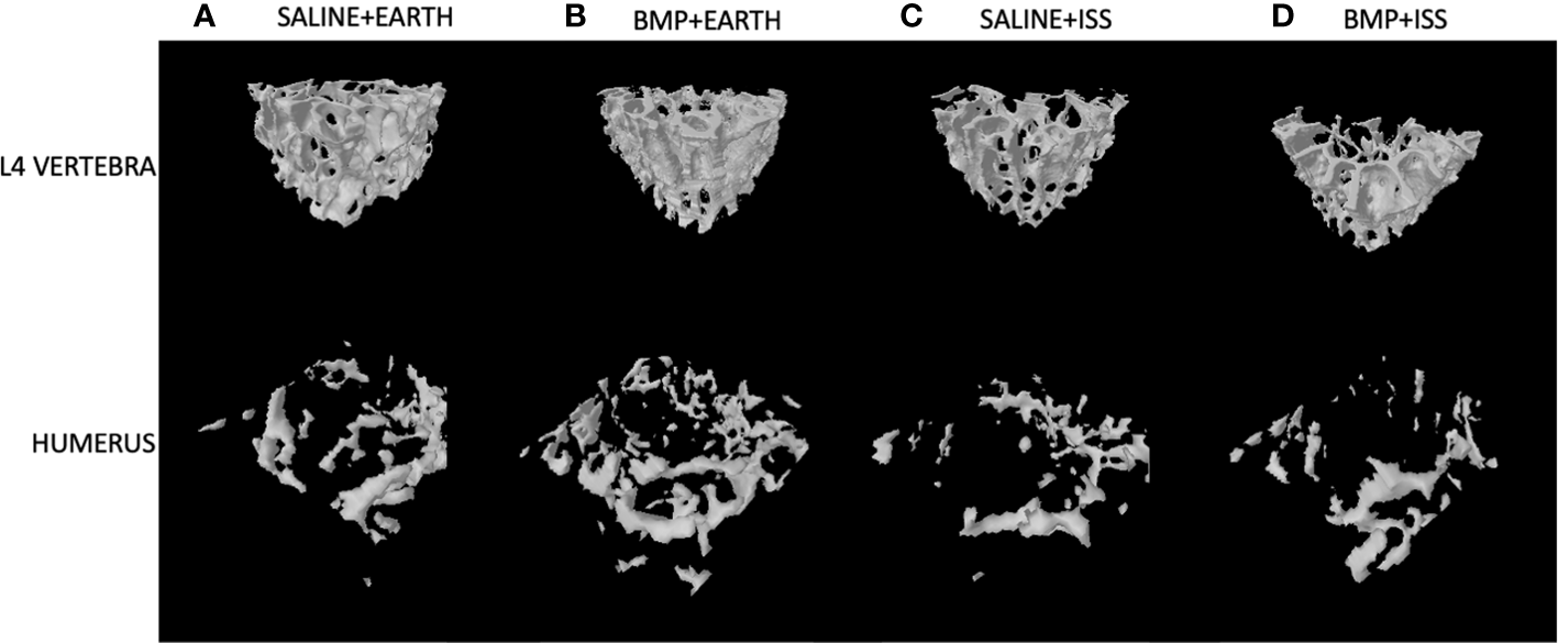 Bone morphogenetic protein 2 (BMP2) has been implicated in the development of bone. BMP2 is known to enhance bone formation through its involvement in molecular pathways associated with mechanical loading (8). Indeed, a direct interaction of BMP signaling and mechanically induced integrin signaling has been reported (9). Furthermore, others have reported a significant upregulation of alkaline phosphatase and Runx2 expression in osteoblast-like MC3T3-E1 cells by the combination of cyclic mechanical loading and BMP2 administration (10). Additionally, BMP2 contributes to phosphorylation within the Smad-dependent pathways (11). As an example, a recent investigation demonstrated that mechanical loading downregulates carbonic anhydrase IX (Car9) mRNA expression through the activation of the BMP-Smad pathway, which alkalizes the local milieu and increases alkaline phosphatase activity, thereby inducing bone formation (12). Although the exact mechanisms underlying the crosstalk between mechanical loading and BMP2 induction have not been fully dissected, previous studies have demonstrated that cyclic stretch enhanced the BMP2-induced osteoblastic differentiation through the inhibition of the Hes-related family bHLH transcription factor with YRPW motif 1 (Hey1), a potent negative regulator of osteogenesis (10). Furthermore, mechanical load has been shown to improve BMP2-induced stimulation in rat bone repair models (13). Because BMP2 is US Food and Drug Administration (FDA) approved for bone-healing indications (14), it is possible that BMP2 may be considered as a drug therapy to treat difficult fractures in space. This is especially true considering the longer-term goals to colonize the moon and/or Mars. Therefore, it is important to examine the utility of using BMP2 in spaceflight for fracture healing (fracture findings are reported in a separate article) and to also examine whether BMP2 treatment locally (at the site of the fracture) impacts distant skeletal sites differentially in spaceflight as compared to on Earth. The latter is the aim of this study. Indeed, although BMP2 is typically thought of as an important osteogenic approach to induce bone regeneration, its downstream signaling seems to depend on mechanical loading, as no significant effects were detected in hindlimb-suspended rats (15). As the osteogenic effects of BMP2 at promoting bone formation and healing are enhanced with mechanical loading by modulating cell differentiation (13), our primary hypothesis was that in spaceflight, the systemic effects of BMP2 on weight-bearing bones would be blunted compared to that observed on Earth. To test this hypothesis, we used micro-computed tomography (µCT) to analyze the bone phenotype of the following non-weight-bearing bones, calvarium, mandible, incisor, ribs, and sternum, and the following weight-bearing bones, vertebrae, humerus, and tibia.
