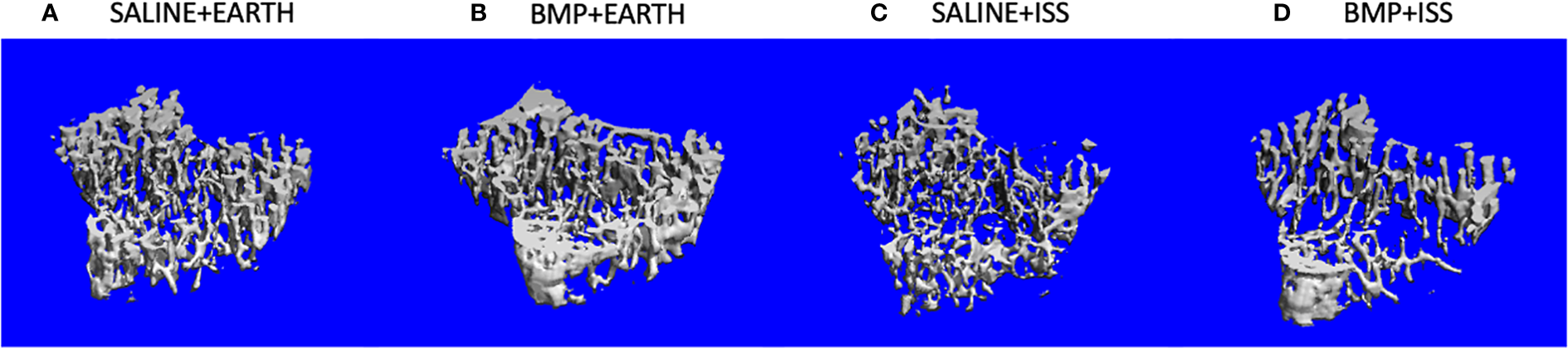 Of note, one mouse belonging to the Saline+ISS group was euthanized 12 days after launch based on veterinarian consultation due to the limited activity of this mouse compared to its cohort. Five mice belonging to the BMP2+ISS group were either discovered to be dead (1–7 days after launch) or were euthanized based on veterinarian consultation determining them to be grossly moribund/distressed (3–7 days after launch, 1–8 days after launch). The details surrounding the investigation into the cause of these deaths/morbid nature are detailed elsewhere (22). In brief, no conclusive cause of death was identified for the BMP2+ISS group. However, in an attempt to assist with this investigation, three healthy BMP2+Earth mice were euthanized early as controls (9 days after launch). The data presented in this article are only from mice that remained in the study until the planned euthanasia (24–28 days after launch) and for which the surgical leg was removed from the mice at the time of euthanasia (maximum of five mice/group except for BMP2+Earth group).