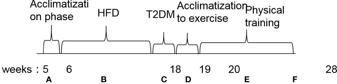 Flowchart of the experimental design. (A) Acclimatization phase. (B) High-fat diet induction for diabetic animals and commercial feeding in non-diabetic mice. (C) Injection of streptozotocin (100 mg/kg) in diabetic groups. (D) Acclimatization to exercise. (E) Physical training. (F) End of experiment. Euthanasia and tissue collection. HFD, high-fat diet; T2DM, type 2 diabetes mellitus.