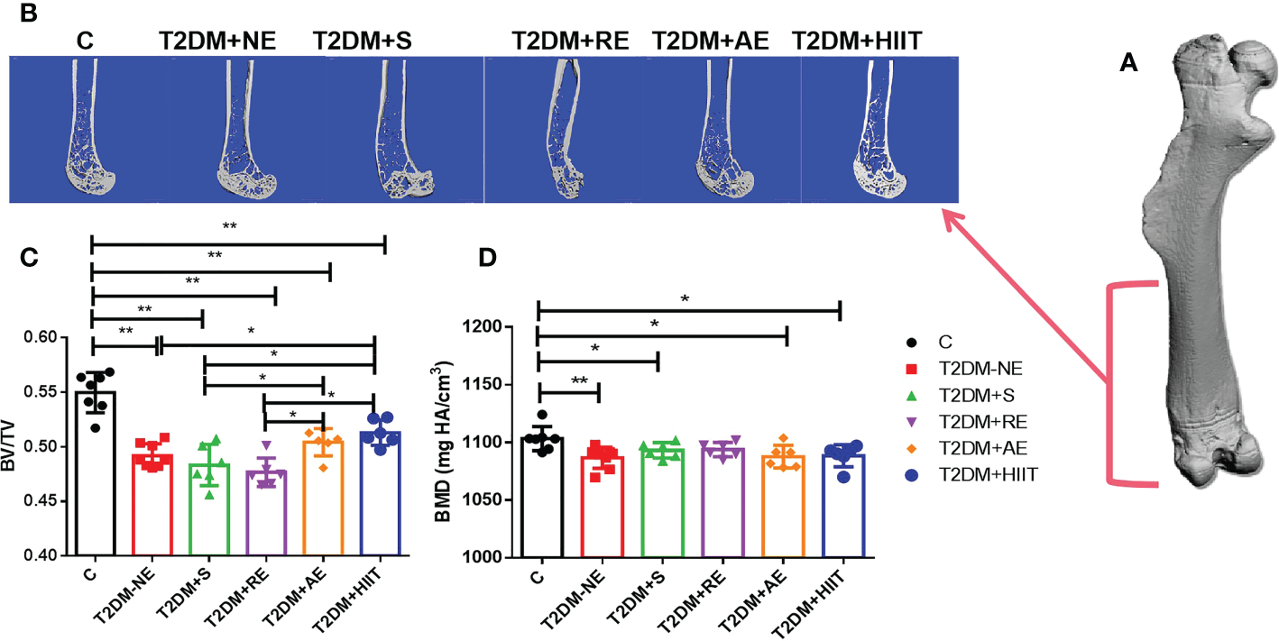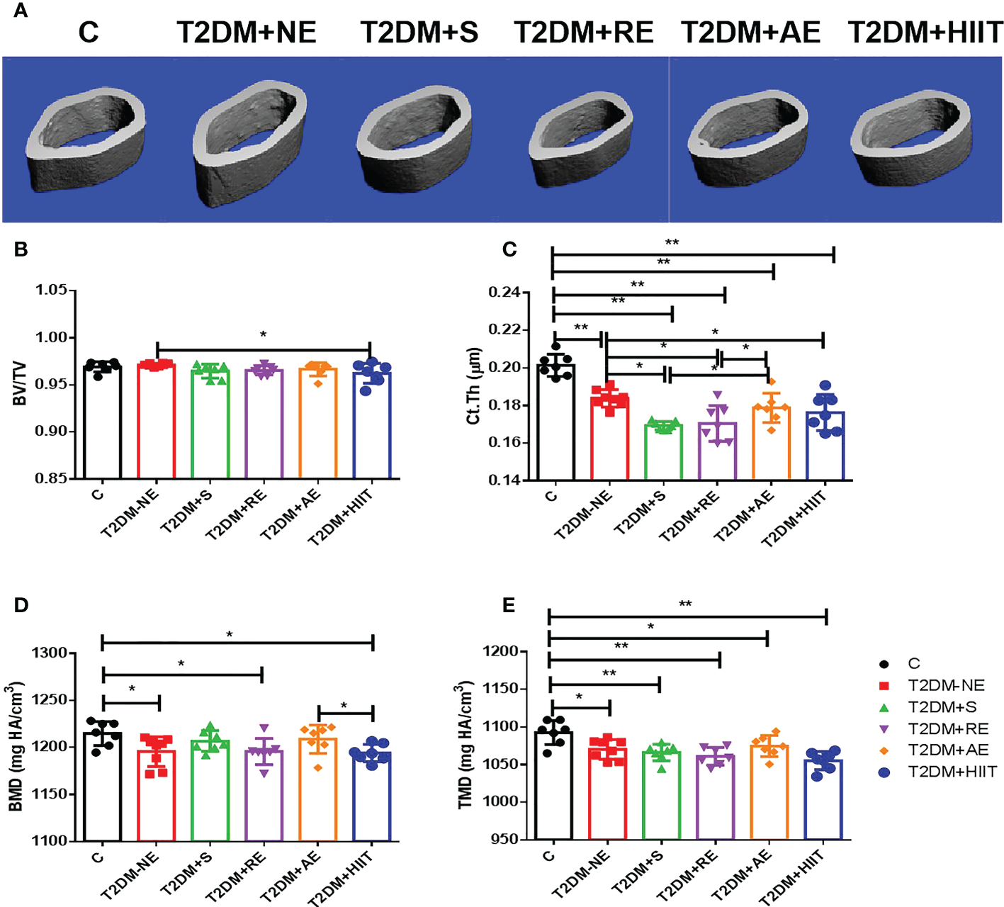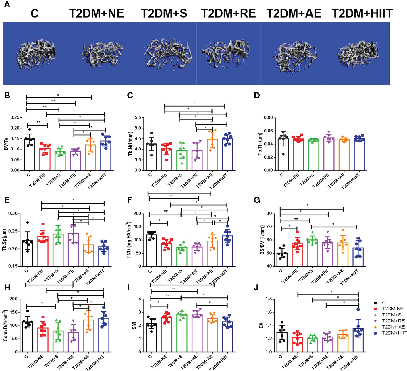 Tb.N, trabecular number; Tb.Th, trabecular thickness; Tb.Sp, trabecular separation; BS/BV, bone surface/bone volume; TMD, tissue mineral density; HA, hydroxyapatite; BV/TV, bone volume/tissue volume; DA, degree of anisotropy; SMI, structure model index; Conn.D, connectivity density; Ct.Th, cortical thickness; BMD, bone mineral density; C, control; T2DM, type 2 diabetes mellitus; NE, no exercise; S, swimming; RE, resistance exercise; AE, aerobic exercise; HIIT, high-intensity interval training.