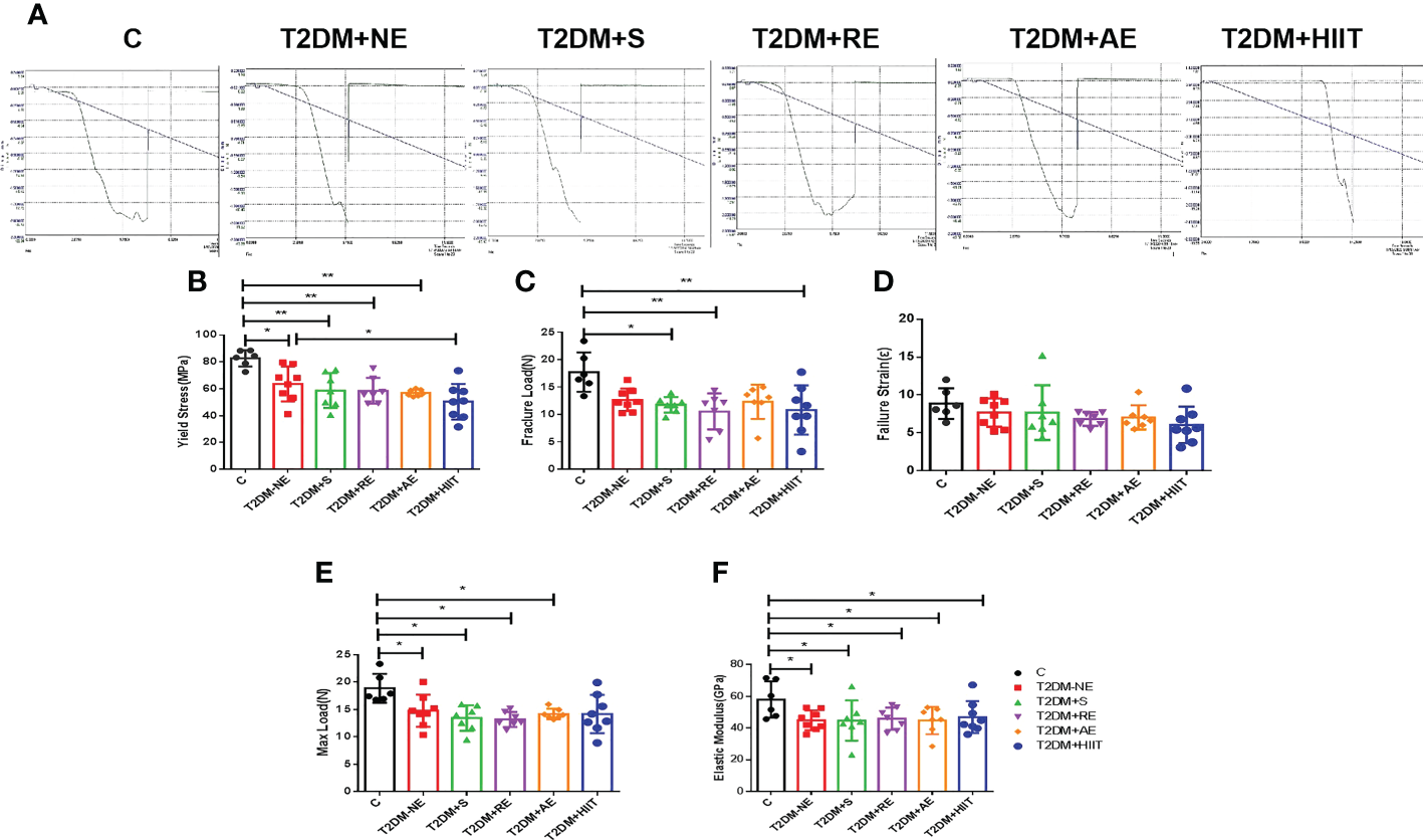 High-fat diet decreased the maximum load, fracture load, yield stress, and elastic modulus in type 2 diabetes mellitus (T2DM) mice. The yield stress of the T2DM plus high-intensity interval training (T2DM+HIIT) group was worse compared with the T2DM without exercise (T2DM+NE) group. (A) Mechanical properties measured using three-point bending tests. (B-F) Yield stress, maximum load, failure strain, fracture load and elastic modulus. Data are the adjusted means ± SD, n ≥ 6 per group. **p < 0.01, *p < 0.05 [independent-samples t-test was used to analyze the control (C) and diabetes model (T2DM+NE) groups, while one-way ANOVA followed by least significant difference (LSD) post-hoc analysis was performed for comparisons within the physical exercise groups].