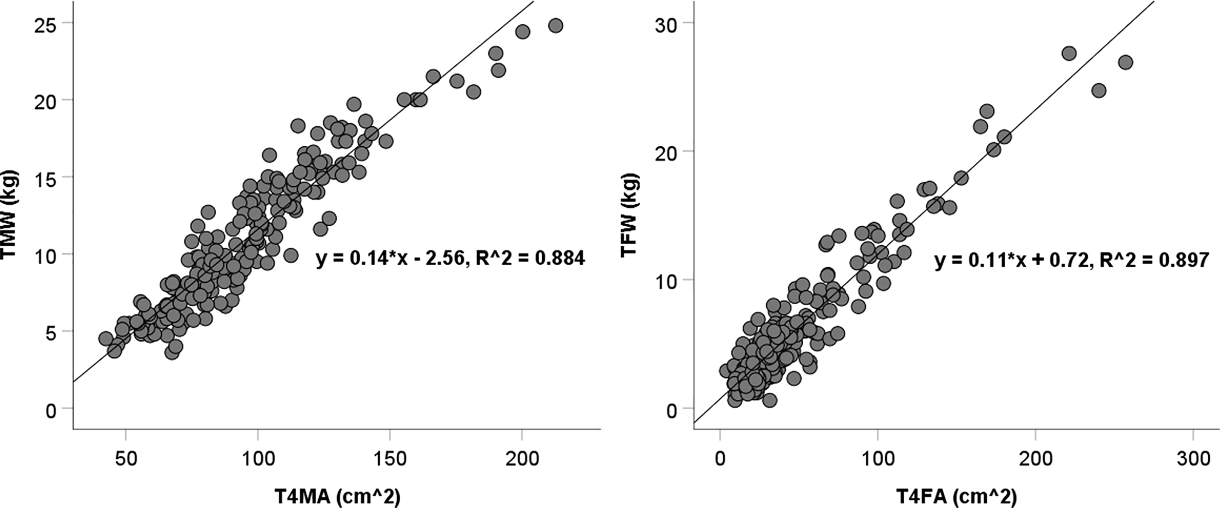 Scatter plots show the T4MA and T4FA assessed by chest CT and TMW and TFW assessed by BIA (Figure 1). The T4MA showed a strong correlation with TMW (TMW = 0.14 T4MA – 2.56; R2 = 0.884; P <.001) and T4FA showed a strong correlation with TFW (TFW = 0.11 T4FA + 0.72; R2 = 0.897; P <.001).