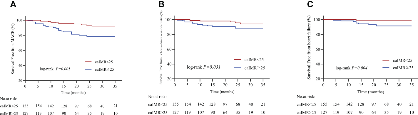 (A) Kaplan-Meier survival curves for MACE in CCS patients with high caIMR vs. low caIMR. (B) Kaplan-Meier survival curves for ischemia-driven revascularization in CCS patients with high caIMR vs. low caIMR. (C) Kaplan-Meier survival curves for heart failure in CCS patients with high caIMR vs. low caIMR. MACE, major adverse cardiovascular events; caIMR, coronary angiography−derived index of microcirculatory resistance.