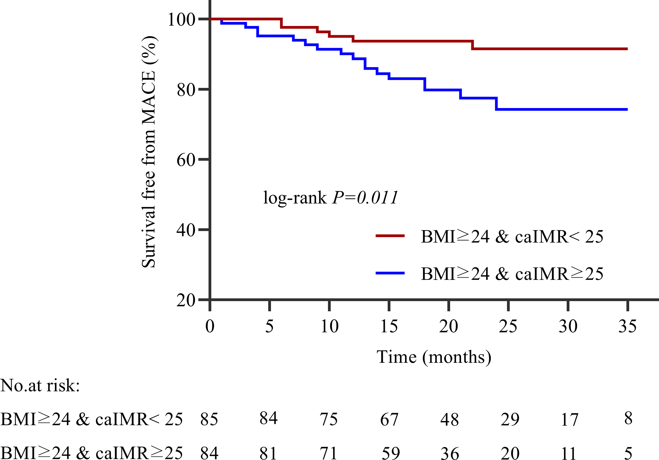Kaplan-Meier survival curves for MACE in overweight patients with high caIMR vs. low caIMR. caIMR: coronary angiography−derived index of microcirculatory resistance; BMI: body mass index.