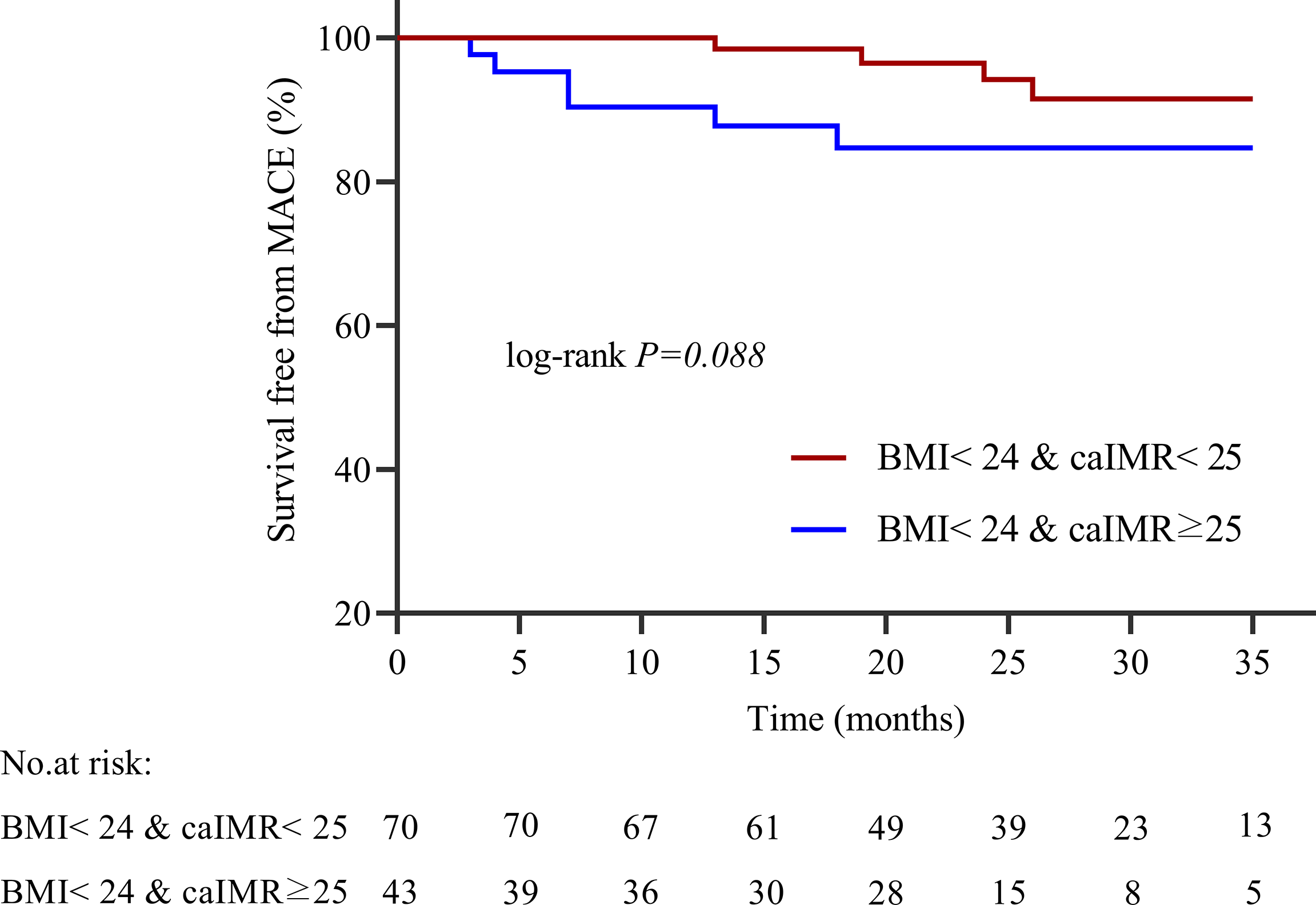 Kaplan-Meier survival curves for MACE in normal weight patients with high caIMR vs. low caIMR. caIMR, coronary angiography−derived index of microcirculatory resistance; BMI, body mass index.