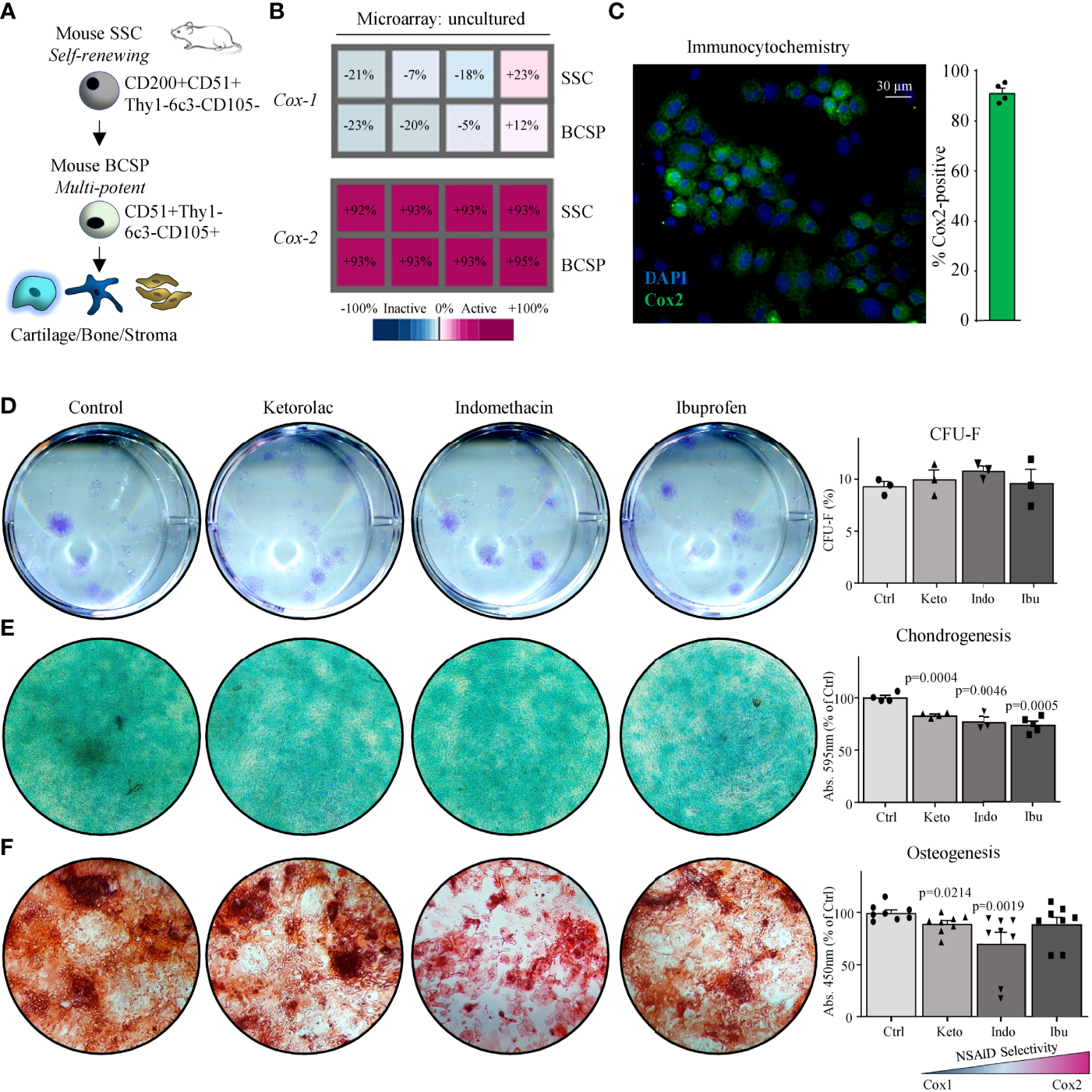 Microarray data of freshly purified skeletal lineage cell populations from day-10 mid-diaphyseal femoral fractures (Figures S1A, B) demonstrated that Cox-2 but not Cox-1 mRNA was abundantly expressed in freshly isolated mouse SSCs (CD45-Ter119-Tie2-Thy1-6c3-CD51+CD105-CD200+) and BCSPs (CD45-Ter119-Tie2-Thy1-6c3-CD51+CD105+) (Figures 1A, B). Additionally, primary mouse SSCs (mSSCs) cultured in vitro expressed high levels of COX2 (Figure 1C). When we seeded freshly sorted fracture mSSCs at clonal density and continuously treated expansion cultures with the common NSAIDs Ketorolac (Keto), Indomethacin (Indo), or Ibuprofen (Ibu) we did not observe any changes to the fibroblast colony forming unit (CFU-F) ability as well as the size of the colonies compared to controls (Figures 1D and S1C). This suggested that proliferation of mSSCs was most likely not affected by NSAID treatment. Next, we examined whether NSAIDs inhibited chondrogenic and osteogenic differentiation capacity of mSSCs in vitro. All three NSAIDs tested significantly inhibited chondrogenic differentiation in mSSC compared to controls as determined by Alcian Blue staining quantification (Figure 1E). Similarly, in vitro osteogenic mineralization was strongly diminished in the presence of Ketorolac and Indomethacin (Figure 1F). These results extend the previously reported inhibitory effect of Cox2-inhibition on bone biology in rodents to the purified skeletal stem cell level, indicating a direct role in perturbing endochondral bone formation processes.