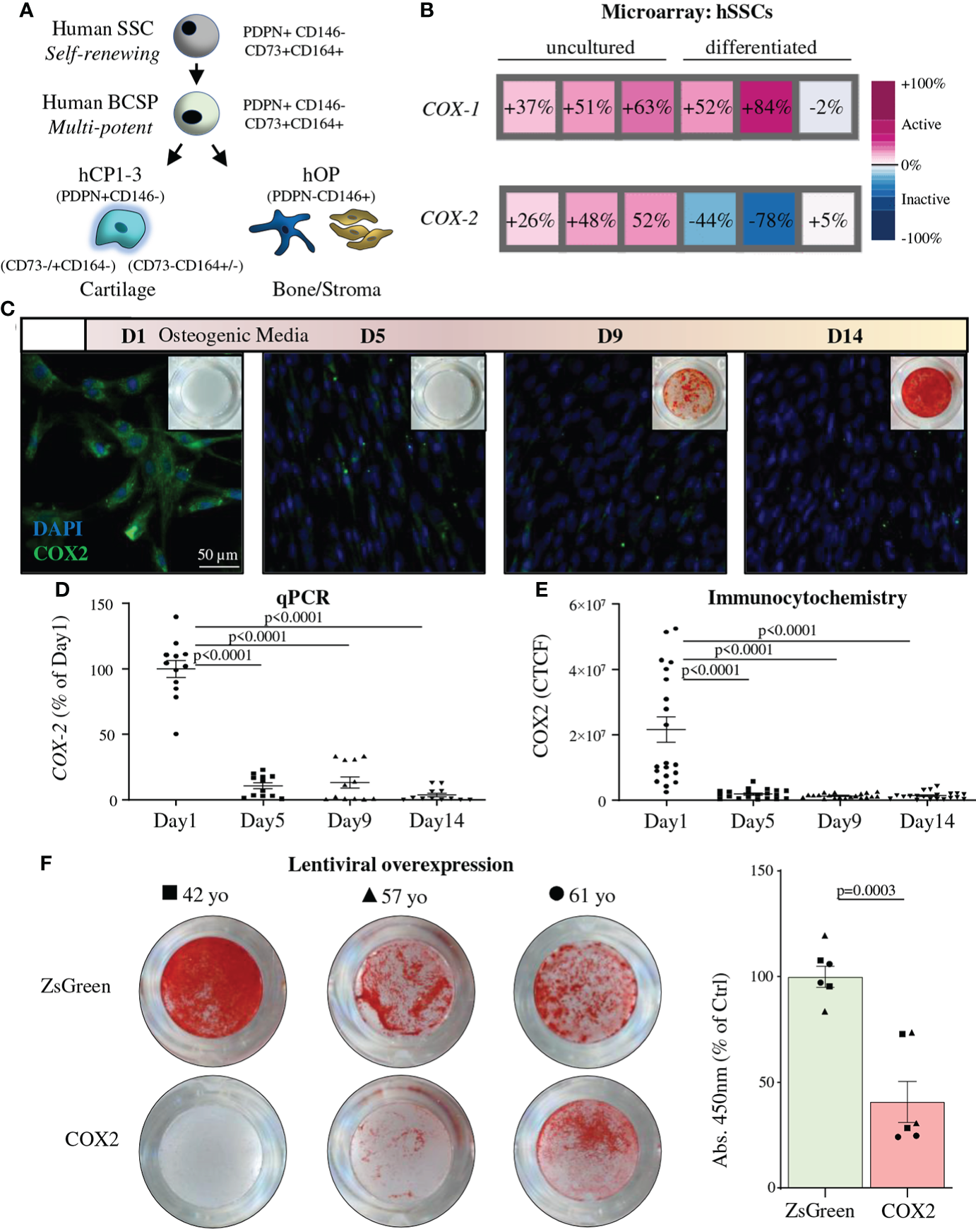 COX2 downregulation is necessary for osteogenic differentiation of human SSCs. (A) The human skeletal stem cell (hSSC) lineage tree as defined by surface marker expression profiles with the hSSC at the apex and the downstream bone cartilage stroma progenitor (hBCSP) which gives rise to committed bone (hOP) and cartilage (hCPs) progenitor cells. (B) Microarray analysis showing COX-1 and COX-2 expression of freshly purified (uncultured) hSSCs from human fracture callus tissue of three different patients as well as their expression after two-week osteogenic differentiation from hSSCs. (C) Representative IHC images of COX2 staining in freshly purified hSSCs at different timepoints during in vitro osteogenesis. (D) Related quantitative PCR of COX-2 expression in the same experiment. n=12 independent replicates of hSSCs from four patients performed in triplicates. (E) Quantification of COX2 ICC staining by CTCF (corrected total cell fluorescence). n=20 independent replicates of hSSCs from two patients (n=10 each). Statistical testing between timepoints by one-way ANOVA with Tukey’s posthoc test. (F) Alizarin Red staining and quantification of hSSCs (with patient age; yo: years old) of lentivirally overexpressed COX2 or ZsGreen controls during osteogenic differentiation. n=6 independent replicates of hSSCs from three patients performed in duplicate. Statistical testing by unpaired Student’s t-test. All data shown as mean ± SEM. All results from at least two independent experiments.