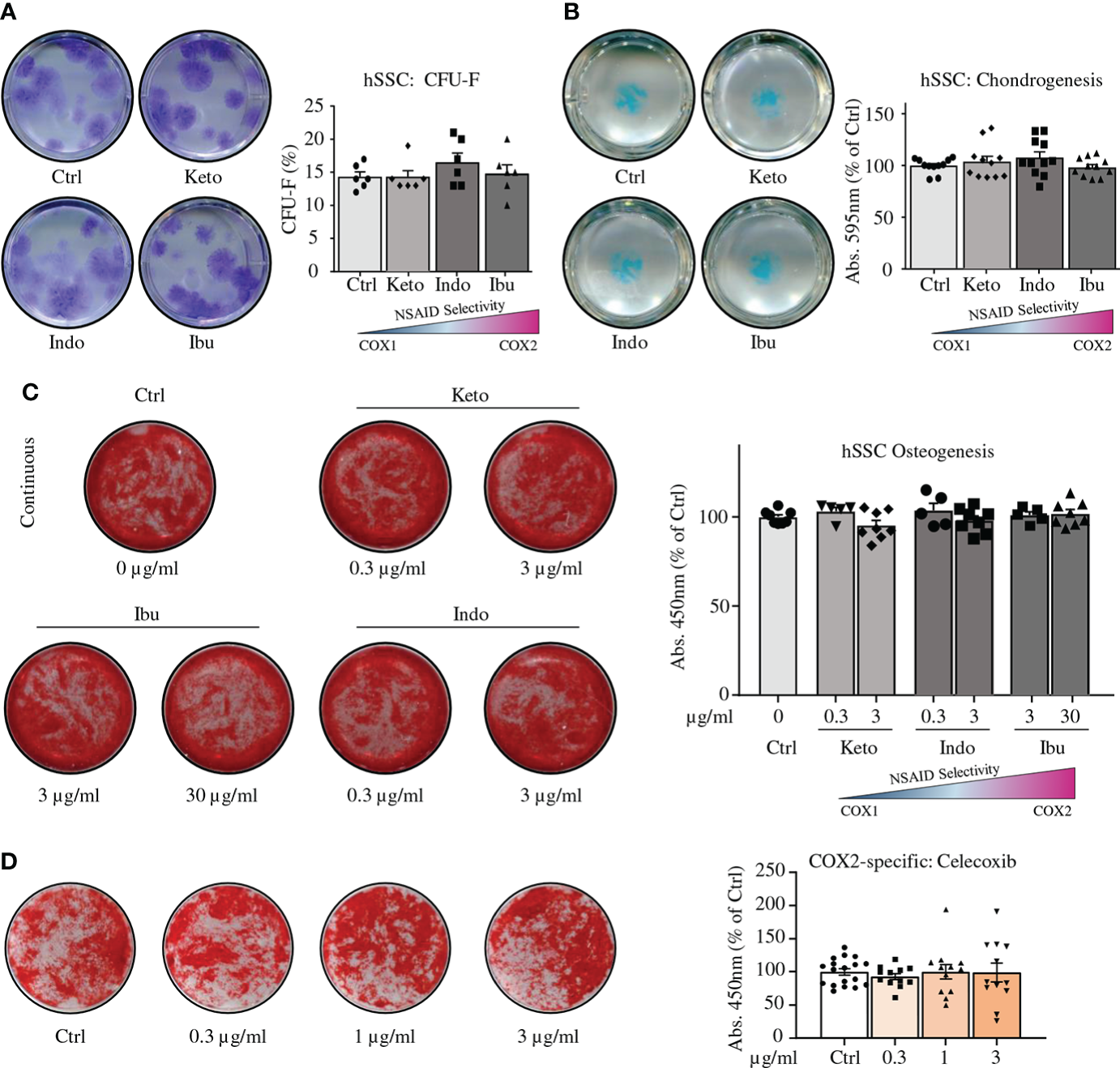 Next, we surveyed reported peak plasma levels of common NSAIDs in human patients and treated colony-forming unit fibroblast assays with the average of these concentrations (Figure S3A) (19–21). Ketorolac (3 µg/ml), Indomethacin (3 µg/ml), or Ibuprofen (30 µg/ml) treatment did not alter clonogenicity of hSSCs compared to controls (Figure 3A). In contrast to mSSCs, chondrogenesis of hSSCs was also unaffected in the presence of these NSAIDs (Figure 3B). Using in vitro bone-forming assays we tested low and peak plasma concentration levels of NSAID and treated hSSC cultures either short-term (first three days) or continuously (throughout differentiation) with NSAIDs. Regardless of NSAID supplementation and duration of treatment, there was no effect on osteogenic potential of hSSCs (Figure 3C and Figures S3B, C). Importantly, when we assayed the effect of the commonly used selective COX2-inhibitor Celecoxib at varying concentration, we could not observe any effect on osteogenic differentiation either (Figure 3D). Since NSAIDs could act downstream of the stem cell level or on a putative distinct SSC lineage, we also asked if short-term or continuous NSAID administration differentially affected osteogenic differentiation of CD146-positive osteoprogenitors (hOPs), previously described as a key source of bone formation in humans (22). We found that neither low nor high doses of NSAIDs added during differentiation, short-term or continuously, inhibited bone mineralization in hOPs (Figures S3D-F). This suggested a species-specific effect of COX-inhibition on bone-forming cell types between mice and humans.