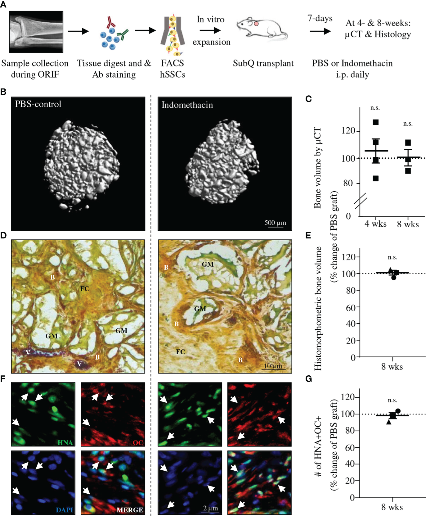 Indomethacin does not interfere with in vivo ossicle formation of human SSCs. (A) Experimental schematic for in vivo grafting of hSSCs and treatment of mice with Indomethacin. (B) Three-dimensional microCT reconstruction of mineralized graft tissue. (C) Quantification of mineralized graft tissues (total bone volume) at 4- (n=4) and 8-weeks (wks; n=3) post transplant between PBS and Indomethacin treated mice. Results from seven experiments with hSSCs from distinct patients. (D) Representative Movat Pentachrome staining of sectioned grafts (B, Bone; FC, Fibrocartilage; V, Blood vessel; GM, Graft material). (E) Histomorphometric quantification of graft bone volume (each data point represents average of three non-adjacent sections per patient hSSC-derived graft). (F) Immunohistochemistry showing graft derived osteogenic cells are of human origin. Human Nuclear Antigen (HNA; green), Osteocalcin (OCN; red), DAPI (blue). (G) Quantification of OCN-expressing cells of human origin based on IHC. Data shown as mean + SEM. Statistical testing by paired Student’s t-test (n.s., not significant).
