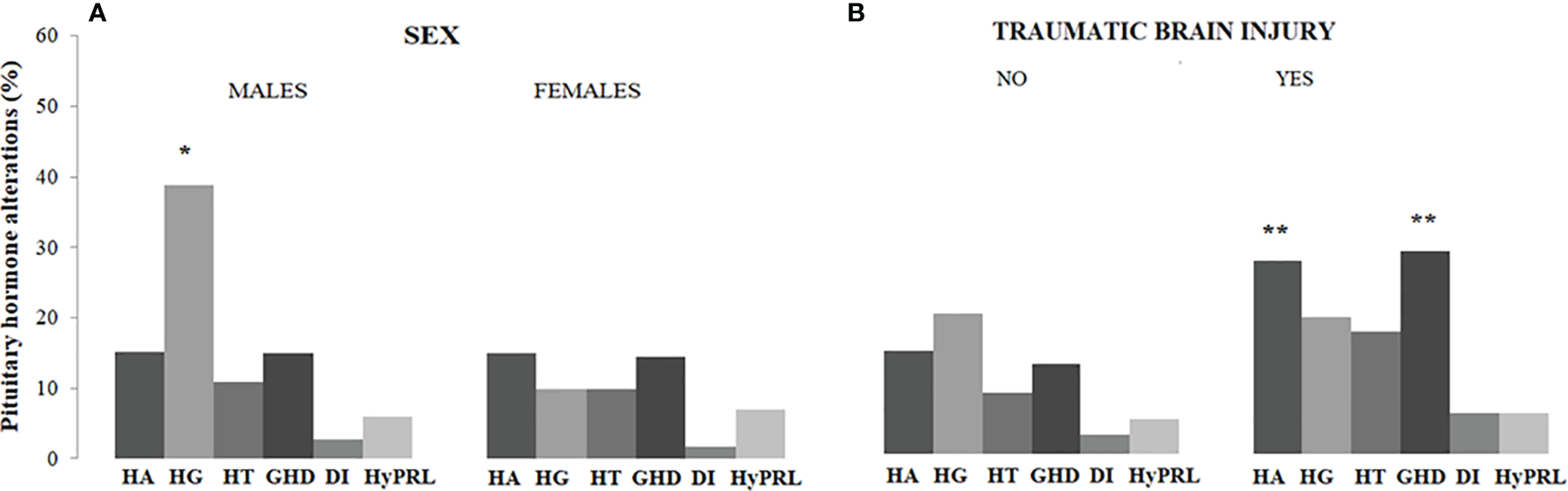 Prevalence of pituitary hormone alterations in male and female patients with PES (A) and in patients with and without a history of traumatic brain injury (B). HA, hypoadrenalism; HG, hypogonadism; HT, hypothyroidism; GHD growth hormone deficiency; DI, diabetes insipidus; HyPRL, hyperprolactinemia; * and **, statistically significant.