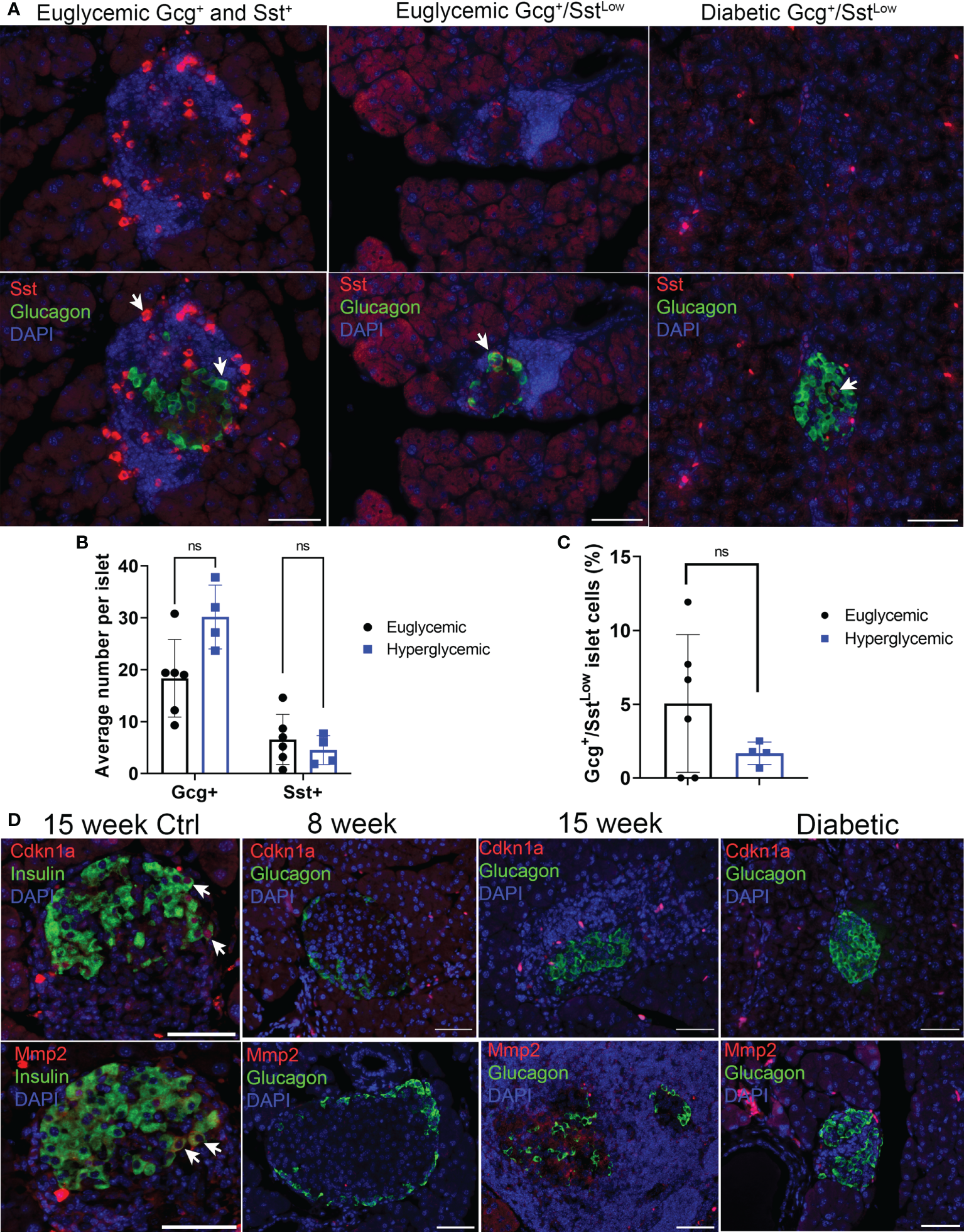 Sst but not senescence markers Cdkn1a and Mmp2 are expressed in Gcg+ cells in pancreas sections of NOD mice. (A) Representative immunohistochemistry staining for Sst and Gcg on pancreas sections from 14-15-week-old euglycemic and diabetic female NOD mice. White arrows indicate examples of either Gcg+ and Sst+ cells in euglycemic mice (first panel), or Gcg+/SstLow co-stained cells in euglycemic and diabetic mice. Scale bars = 50 μm. (B) Quantifications of average number of Gcg+ and Sst+ cells per islet in 14–20-week-old female euglycemic NOD mice (n=6) and age-matched diabetic mice (n=4). Error bars are s.d. ns = not significant by two-tailed T-tests, adjusted for multiple tests by Benjamini-Hochberg method. (C) Quantifications of the percent of Gcg+/SstLow cells per islet in 14–20-week-old female euglycemic NOD (n=6) and age-matched diabetic mice (n=4), error bars are s.d. ns = not significant. (D) Representative immunohistochemistry for Cdkn1a or Mmp2 with Ins in 15-week NOD pancreas as a control or Cdkn1a or Mmp2 with Gcg in NOD mice at indicated stages. Cdkn1a and Mmp2 were stained from serial sections of the same islet. White arrows indicate co-stained cells. Scale bars are 50 μm.