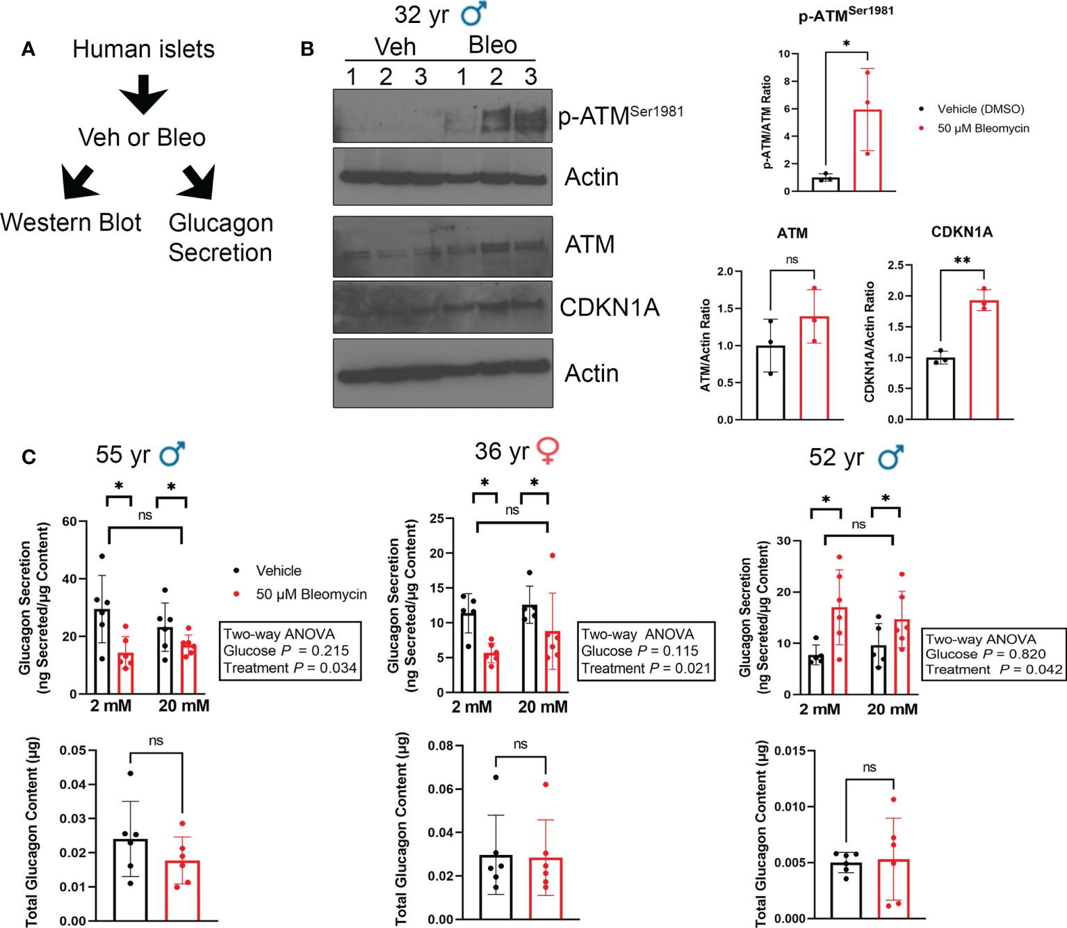 Glucagon secretion is altered during senescence induction in human islets ex vivo. (A) Isolated islets from nondiabetic control donors were treated in culture with 50 μM bleomycin to induce DNA damage and senescence, or with vehicle (0.15% DMSO) as a control for 48 h followed by drug-washout and culture in drug-free media for 4 days before harvesting for western blot analysis or glucagon secretion assays. (B) Western blot analysis of phosphorylated ATMSer1981, total ATM and CDKN1A four days after bleomycin treatment to induce senescence as in (A). β-Actin was a loading control. Data are mean and s.d. of n = 3 biological replicates. *p < 0.05, **p < 0.005, ns = not significant, two-tailed T-tests. (C) Glucagon ELISAs were carried out after sequential incubation of control and senescent islets from three different donors in low glucose (2 mM) or high glucose (20 mM). Data are means of n = 6 biological replicates (different wells of islets from the same donor), error bars are s.d and were analyzed by Two-way ANOVA as indicated.