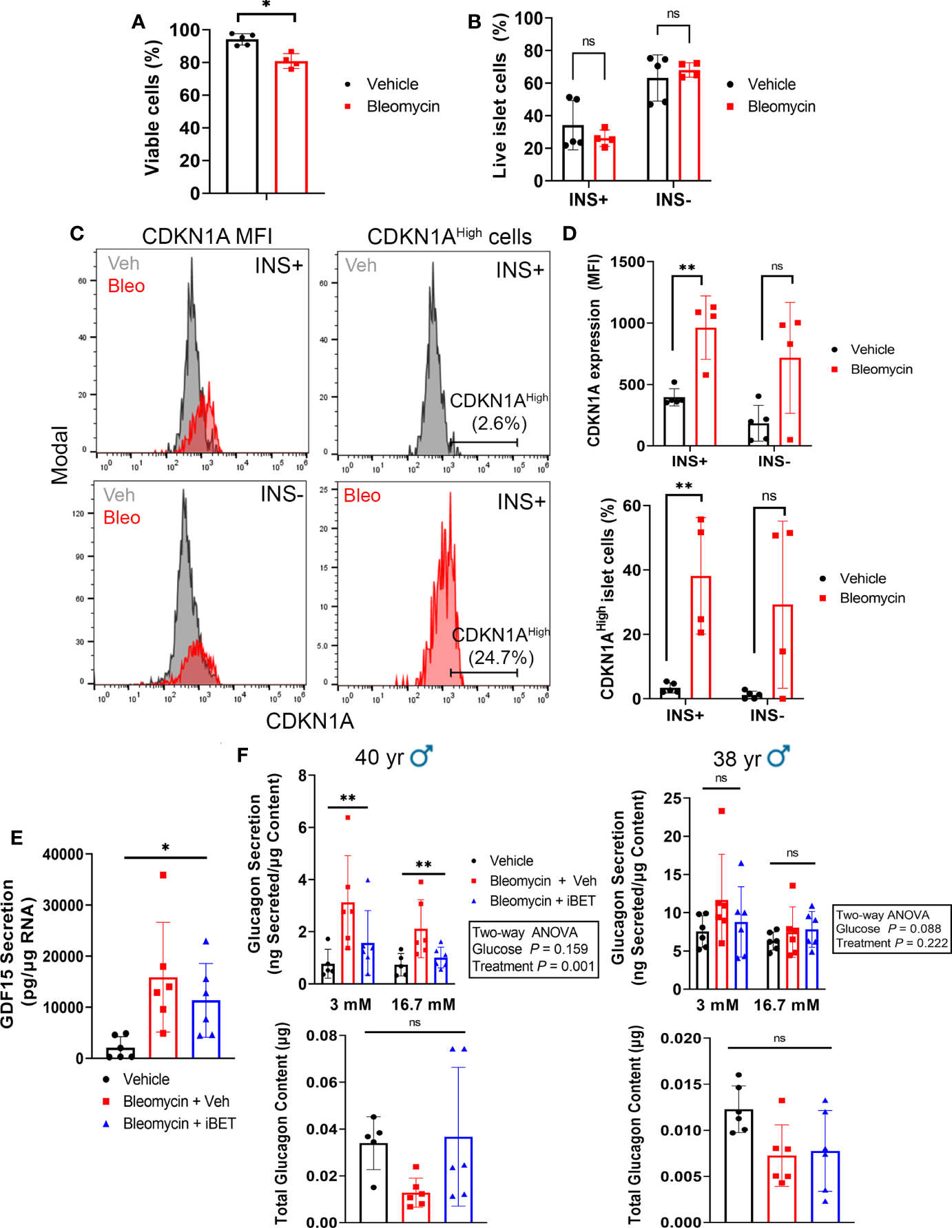Since both α and β cells could develop senescence in our human islet model, the glucagon secretion phenotypes may be due to direct DNA damage and senescence induction in α cells. To determine whether β cells and/or non-β cells were becoming senescent in our model, we used intracellular flow cytometry to score the frequency of INS+ cells (β cells) versus INS- (non-β cells) that expressed CDKN1A in vehicle control and bleomycin-treated islets at day 4 post-drug removal (Figure 6). Using islet samples from three donors we found that bleomycin treatment only led to a modest decrease in cell viability in comparison to controls (94% versus 80%, Figure 6A). However, on average 25-50% of live islet cells were INS+ whereas 50-75% were INS- and senescence induction did not significantly alter the frequency of viable INS+ versus INS- islet cells (Figure 6B). Bleomycin treatment led to a consistent and significant increase in CDKN1A expression in β cells, as there was a 2-3-fold increase in CDKN1A median fluorescence intensity (MFI) in the INS+ population (Figure 6C). In contrast, INS- islet cells showed variable changes in CDKN1A expression after bleomycin treatment, which on the whole was not statistically significant (Figure 6D). The same effect was found when gating the INS+ or INS- cells expressing the highest levels CDKN1A (CDKN1AHigh, ~2-5% of the cells in each population in the control samples) and comparing this subpopulation between bleomycin and control islets (Figure 6C). The percent of CDKN1AHigh cells was consistently and significantly increased in the INS+ subpopulation but was variably affected in INS- cells (Figure 6D). Given that the majority of islet cells in these experiments were INS-/non-β cells (50-75%) and yet a more consistent and reproducible effect of increased CDKN1A expression occurred in the β cells, these data suggest that INS+ β cells preferentially upregulate CDKN1A in our DNA damage-induced senescence culture model as compared to INS-/non-β cells.