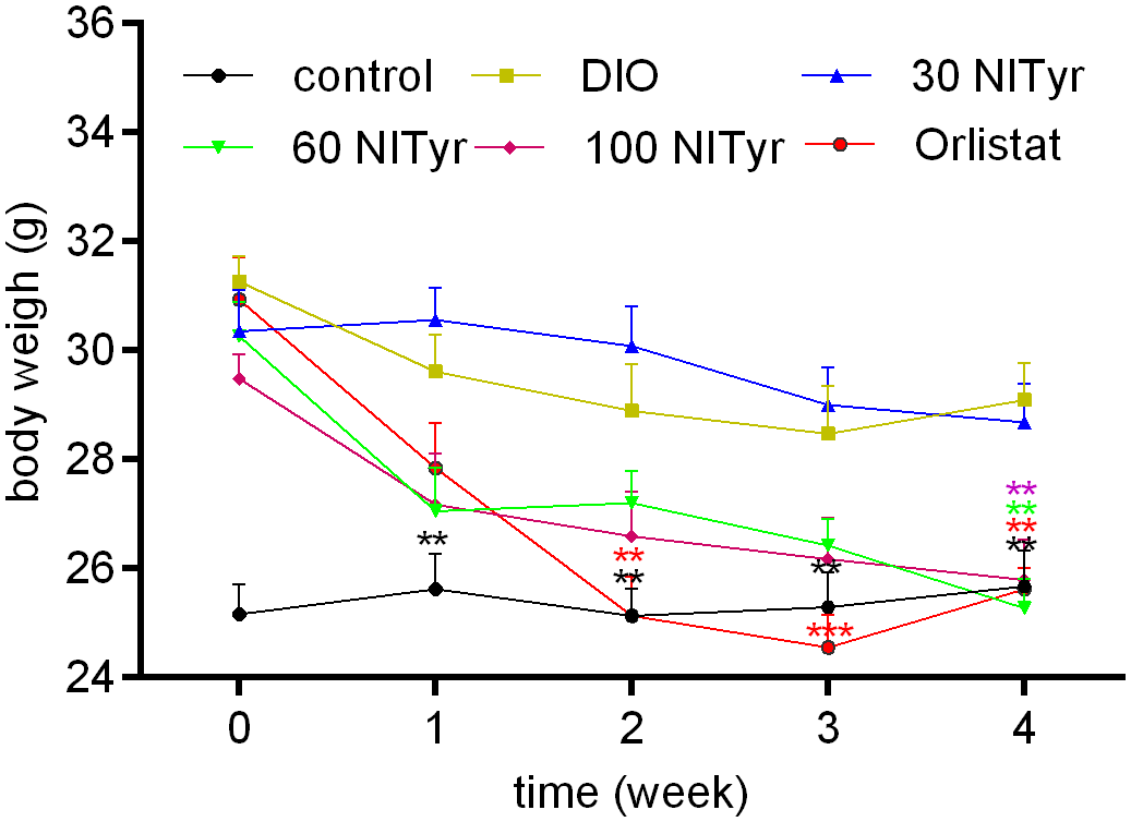 Figure 2 Body weight during 4-week drug intervention period. NITyr and Orlistat promoted weight loss of mice. Control or DIO was treated with Poloxamer 188 aqueous solution. 30 NITyr, 60 NITyr, 100 NITyr and Orlistat were treated with 30 mg/kg NITyr, 60 mg/kg NITyr, 100 mg/kg NITyr, 100 mg/kg Orlistat, respectively. All values were expressed as means ± SD (n = 8). **P < 0.01, ***P < 0.001, as compared with the DIO group.