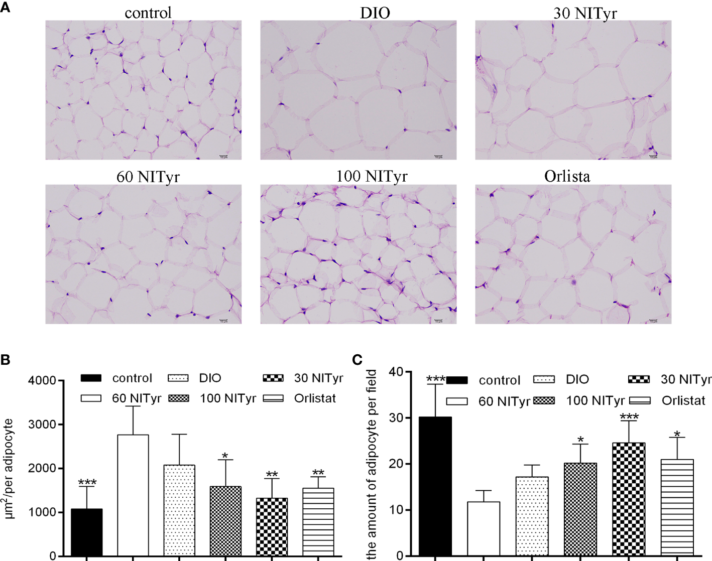 (A) The adipose tissue of mice stained by hematoxylin and eosin (H&E). scar bar = 10 µm. (B) The area of adipocytes in each group under the same field. (C) the number of adipocytes in each group of mice under the same field. The control or the DIO group was treated with Poloxamer 188 aqueous solution. 30 NITyr, 60 NITyr, 100 NITyr and Orlistat were treated with 30 mg/kg NITyr, 60 mg/kg NITyr, 100 mg/kg NITyr and 100 mg/kg Orlistat, respectively. All values were expressed as means ± SD. (n = 4). *P < 0.05, **P < 0.01, ***P < 0.001, as compared with the DIO group.