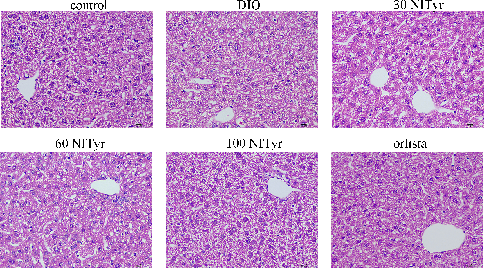 The liver tissue of mice stained by the H&E method. scar bar = 10 µm. The control or DIO group was treated with Poloxamer 188 aqueous solution. 30 NITyr, 60 NITyr, 100 NITyr and Orlistat were treated with 30 mg/kg NITyr, 60 mg/kg NITyr, 100 mg/kg NITyr, 100 mg/kg Orlistat, respectively.