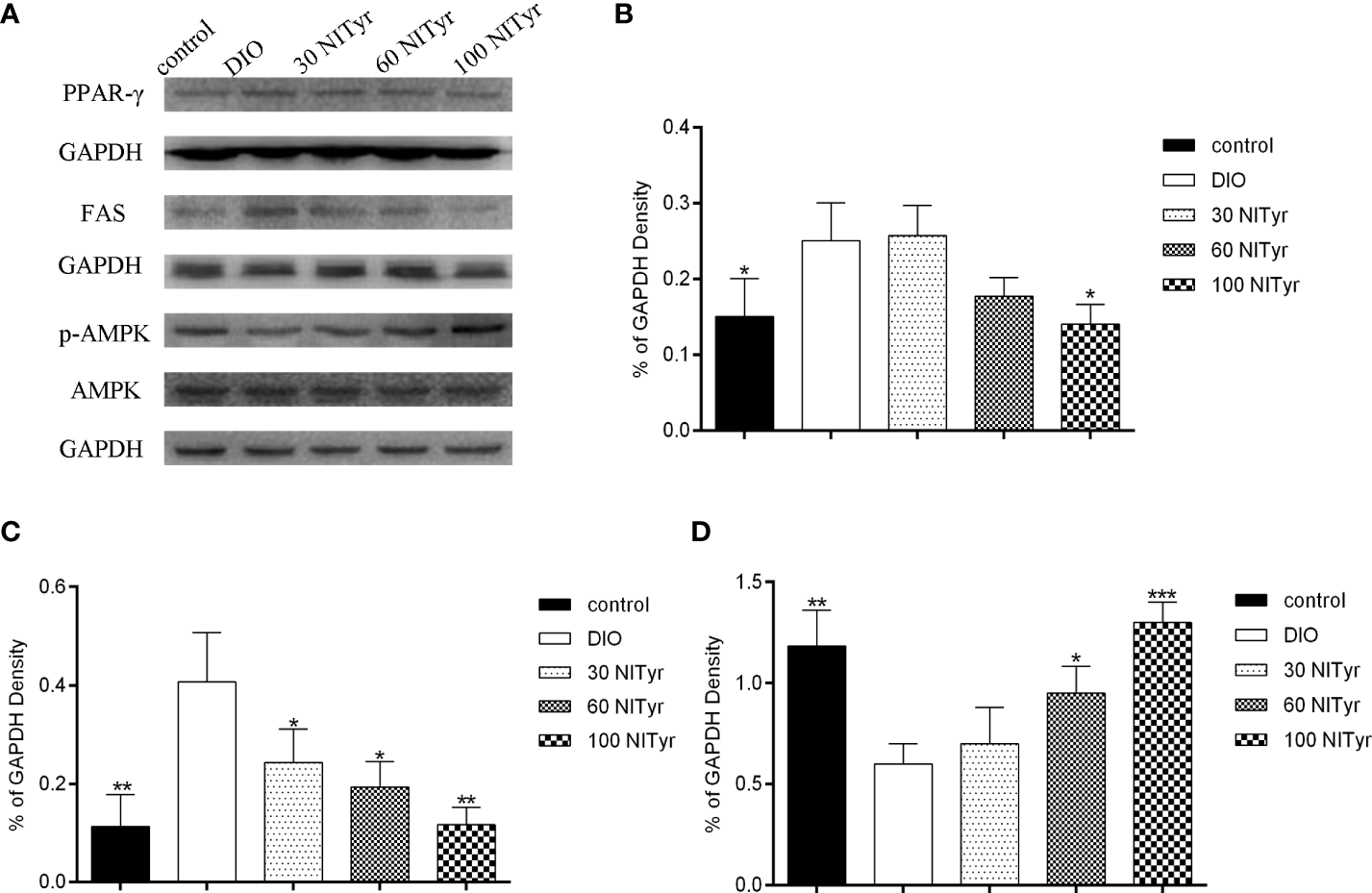 Effect of NITyr on the expression of key factors in adipogenesis. (A) Western blot analysis of PPAR-γ, FAS and p-AMPK. (B) PPAR-γ expressions were normalized that of GAPDH. (C) FAS expressions were normalized that of GAPDH. (D) p-AMPK expressions were normalized that of AMPK. The control or DIO group was treated with Poloxamer 188 aqueous solution. 30 NITyr, 60 NITyr and 100 NITyr were treated with 30 mg/kg NITyr, 60 mg/kg NITyr, 100 mg/kg NITyr, respectively. All values were expressed as means ± SD. (n = 3). *P < 0.05, **P < 0.01, ***P < 0.001, as compared with the DIO group.