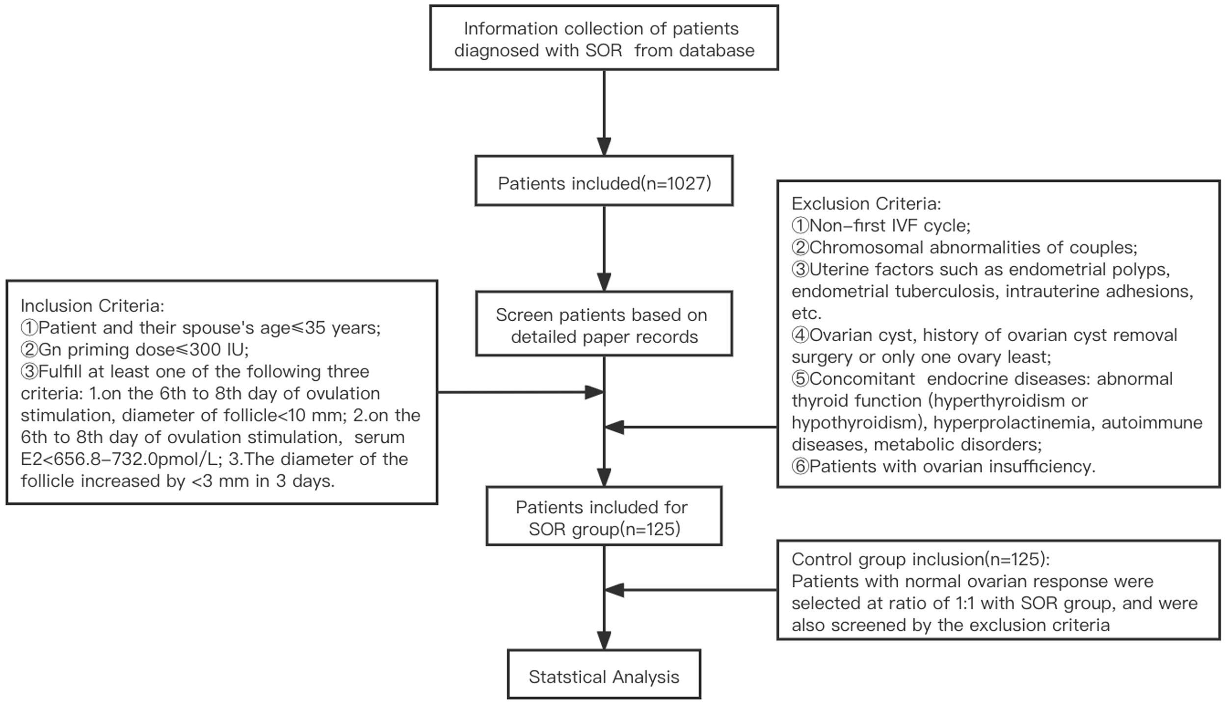 A retrospective analysis was performed on clinical data from 125 patients with SOR (slow growth of follicles during COH and low serum E2 level, based on diagnostic criteria of SOR talked above) who underwent IVF-ET at Peking University Third Hospital from January 2017 to January 2019. According to the COH ovarian stimulation protocol, they were divided into ultra-long and long protocol group (71 cases) and antagonist protocol group (54 cases). Due to the limited sample size and similarity between the mechanisms of the ultra-long protocol and long protocol, both groups were combined into a single group for the analysis. The control group consisted of 125 patients with normal ovarian response who had undergone IVF-ET during the same period as the SOR group, with a similar number of patients in the corresponding protocol group in the SOR group. Due to attrition resulting from patients who canceled the cycle, some medical records were incomplete. Therefore, canceled cycles were not analyzed in this study. An overview of the patient recruitment process is shown in Figure 2.