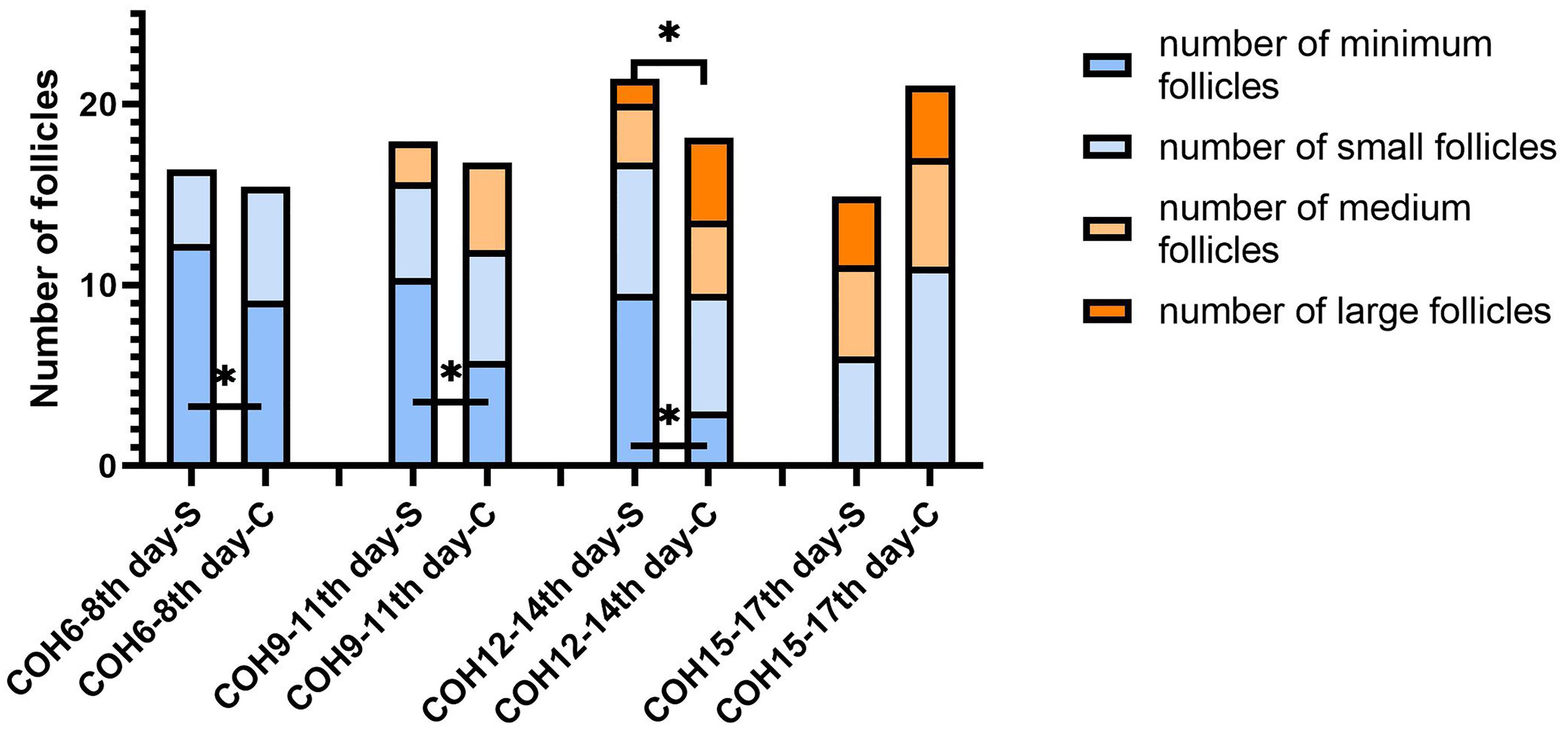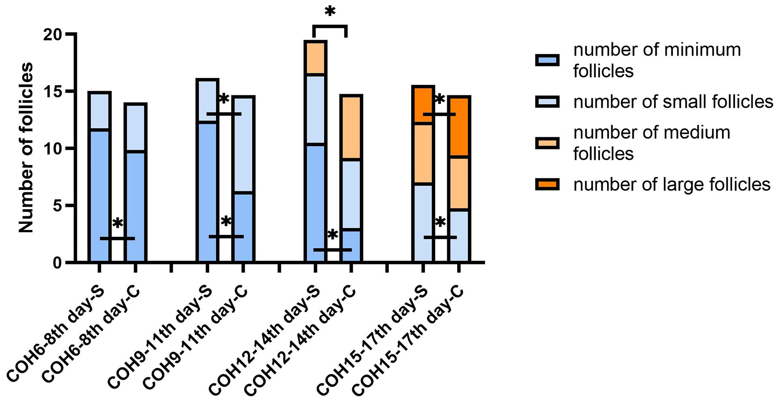 Changes in the number of follicles of different sizes during the COH process in the ultra-long/long group patient (note (1): *Indicates statistically significant difference (P < 0.05); (2) S:SOR group; C: control group; (3) n (SOR group) = 71, n (control group) = 71).