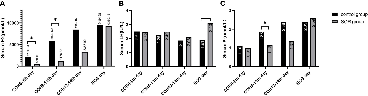 In the ultra-long and long protocol group, the SOR group had a longer response time to downregulation and longer Gn application time than the control group, and their total dose of Gn using was more than that of the control group. The basic LH/FSH ratio of the SOR group was 0.63 ± 0.37, significantly lower than the value of 0.84 ± 0.65 in the control group (P < 0.05) (Supplementary Table 2). The serum E2 level of COH on days 6–8 was 231.85 ± 108.58 pmol/l, significantly lower than the value of 1007.58 ± 1002.80 pmol/l in the control group (Figure 3A), and the serum P level of COH on days 12–14 was 1.09 ± 0.55 nmol/l, significantly lower than the value of 2.02 ± 1.11 nmol/l in the control group (P < 0.05) (Figure 3B) (Supplementary Table 2). On HCG day, the PFI and P/E2 ratios in the SOR group were 0.59 ± 0.25 and 0.33 ± 0.24 respectively, higher than those in the control group (0.56 ± 0.41 and 0.12 ± 0.68, respectively), but without statistical significance (Supplementary Table 2).