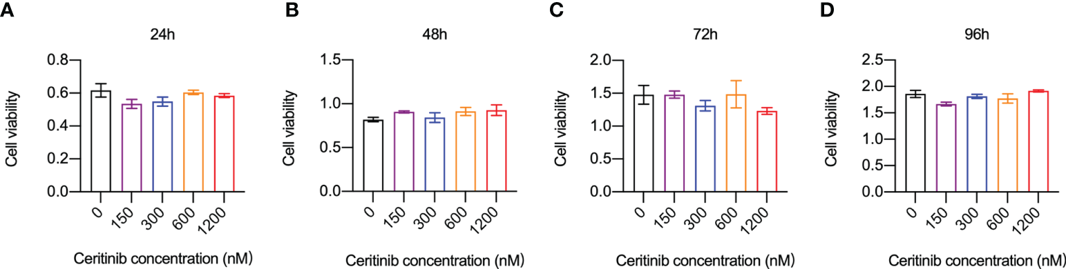 Ceritinib did not affect BMM-cell in vitro. Cell viability and proliferation capacities (absorbance) of BMMs remained stable when they were incubated with ceritinib (150, 300, 600, and 1200 nM) for 24 (A), 48 (B), 72 (C), and 96 h (D).