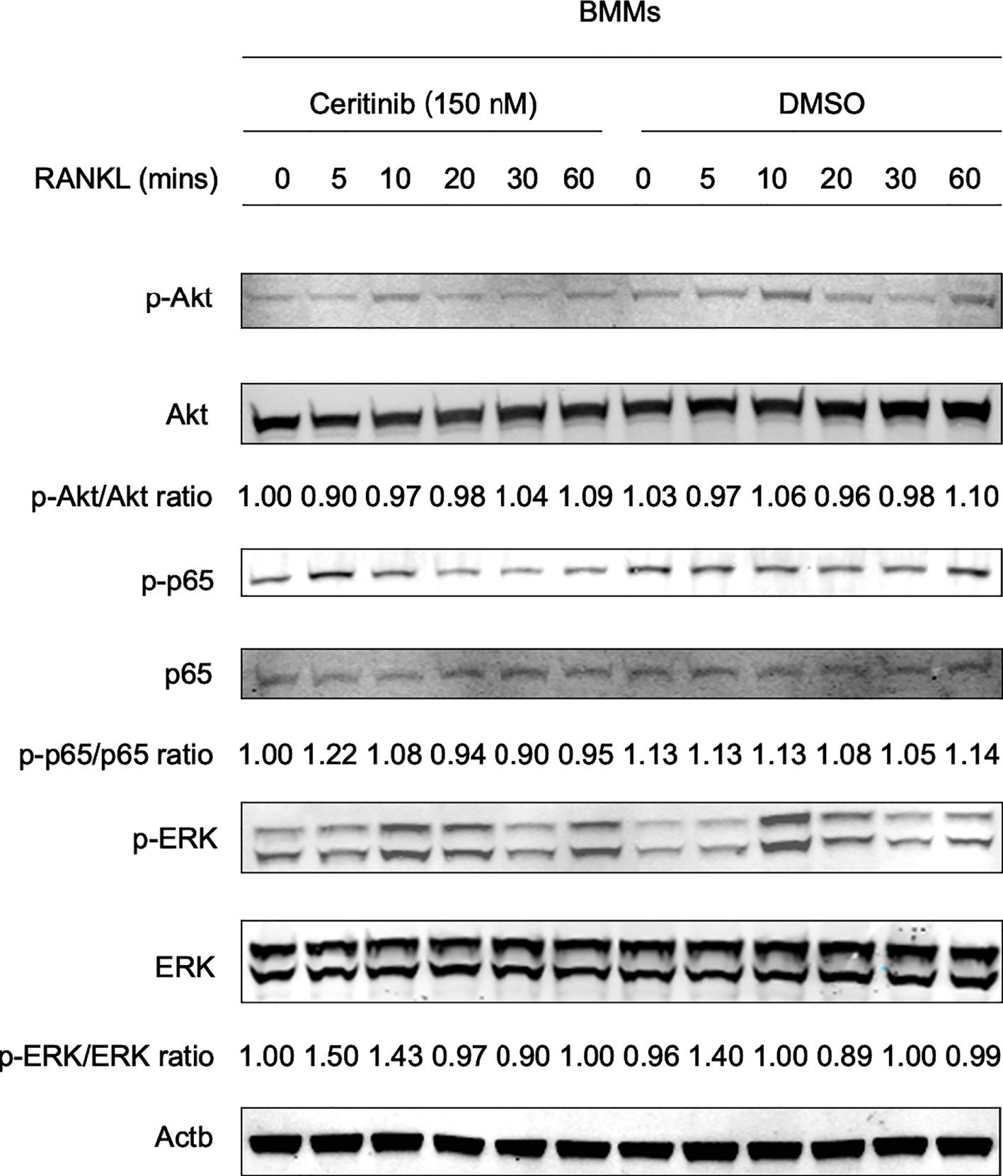 Based on the observed inhibitory effect of ceritinib on osteoclast formation, we aimed to elucidate the possible underlying mechanisms. BMMs were treated with RANKL for 0, 5, 10, 20, 30, and 60 min in the presence or absence of ceritinib. As shown in Figure 3, RANKL activated Akt phosphorylation from 0 to 20 min. However, decreased Akt activation was observed in the ceritinib-treated group. In addition, phosphorylation of p65 was observed in the RANKL-treated group. However, ceritinib almost completely abolished the activation of p65. Interestingly, it did not alter the activation of the ERK signaling pathway (Figure 3). Collectively, ceritinib inhibited Akt and p65 phosphorylation during osteoclast formation.