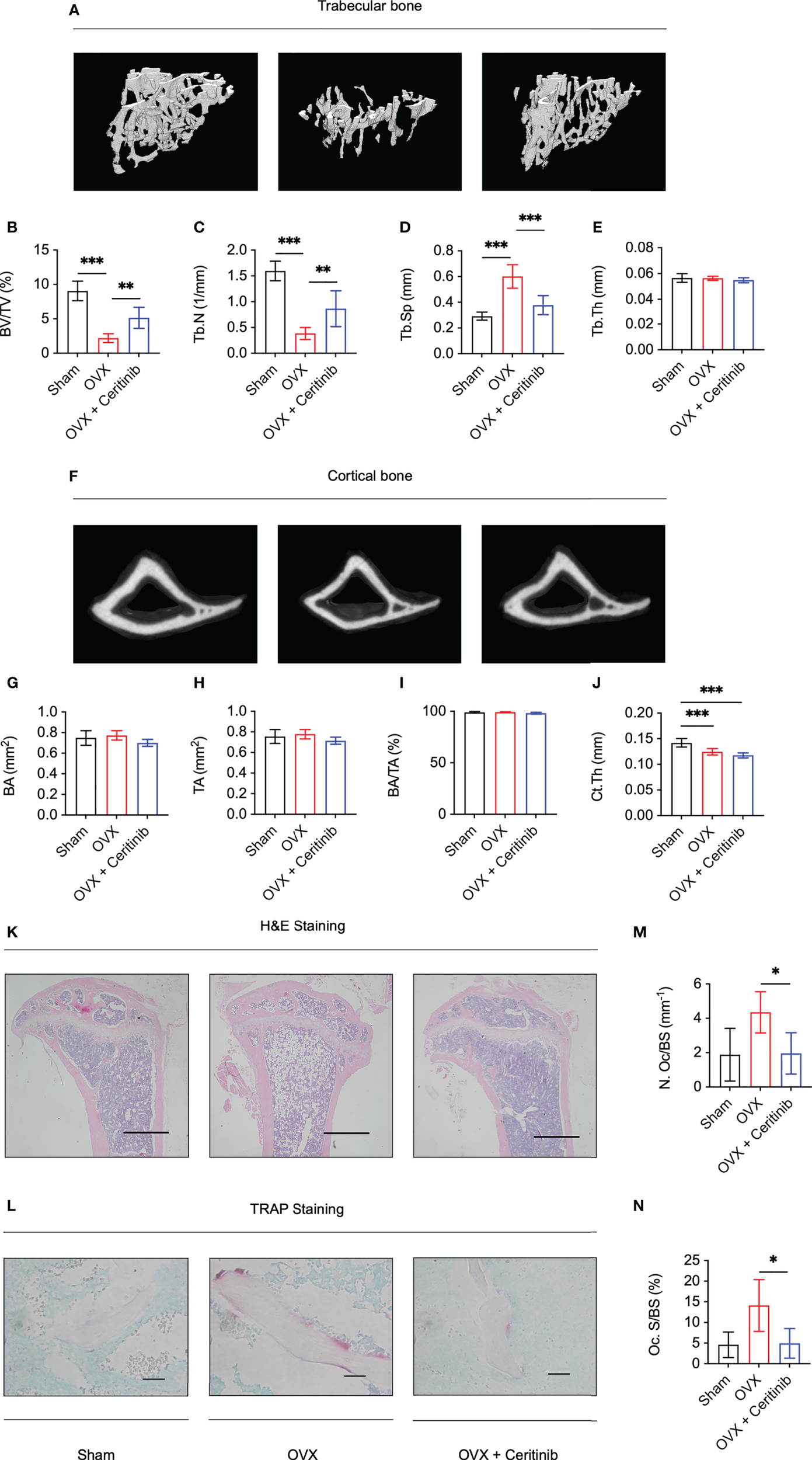 Ceritinib rescued osteoporosis by inhibiting osteoclasts in vivo. (A) Representative 3D micro-CT images of trabecular bone of the Sham, OVX, and OVX plus ceritinib groups. Micro-CT trabecular results suggest higher BV/TV (B) and Tb.N (C), lower Tb.Sp (D), and non-significant Tb.Th (E) in the OVX plus ceritinib group. (F) Representative 3D micro-CT images of cortical bone of the Sham, OVX, and OVX plus ceritinib groups. Micro-CT cortical results suggest no significant changes of BA (G), TA (H), BA/TA (I) and Ct.Th (J) in the OVX plus ceritinib group. (K) Representative images of H&E staining (Scale bar = 100 µm). (L) Representative images of TRAP staining (Scale bar = 2 µm). TRAP staining results demonstrate that ceritinib reduced the number (M) and decreased the surface of osteoclasts (N) per bone surface of trabecular bone compared to those in the OVX group.