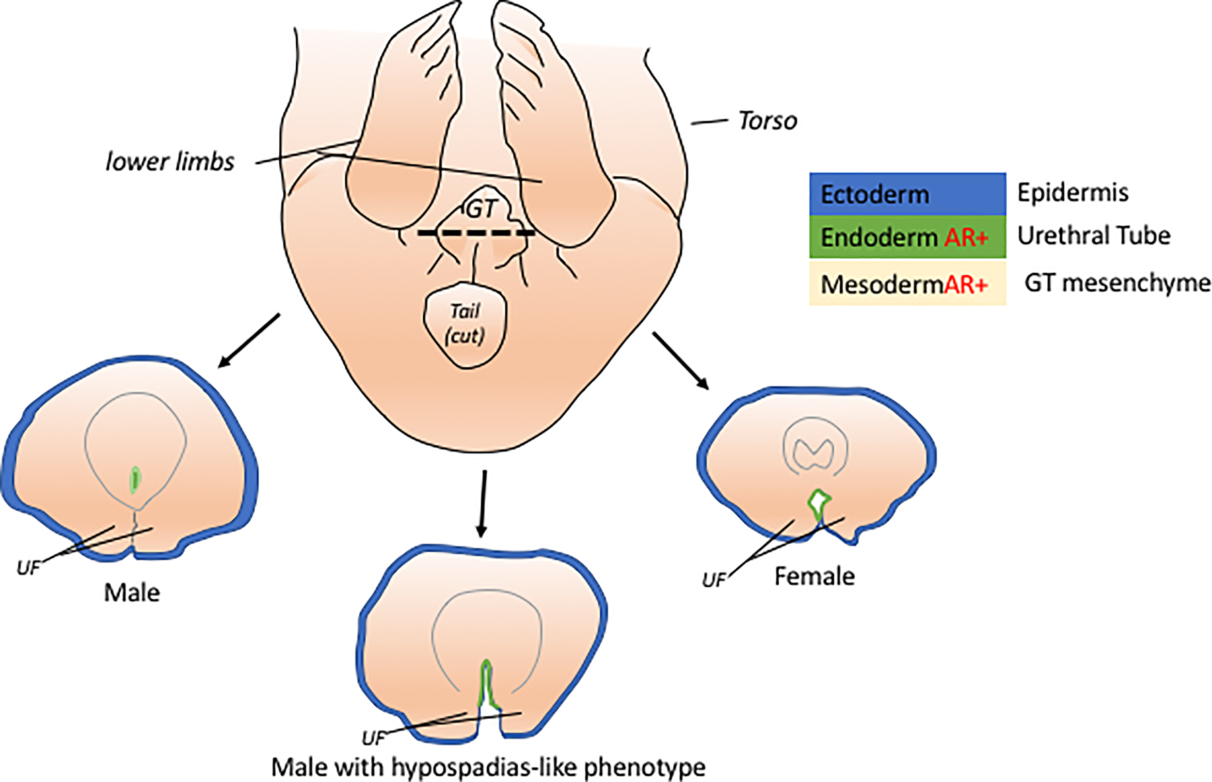 The genital tubercle or GT is the common anlage of the penis and clitoris. The GT has cells from 3 embryonic layers, ectoderm, mesoderm, and endoderm. At early embryonic stage, the male GT is distinguished from female GT through the fusion of the urethral folds (UF) which can be viewed histologically through a cross-section of the GT (dotted line). The masculinization of the male GT is attributed to the active androgen signaling in the endoderm and mesoderm tissues of the GT. Unfused UF in males, hypospadias-like phenotype, are due to disruptions in the signaling of the endoderm and mesoderm of the GT.