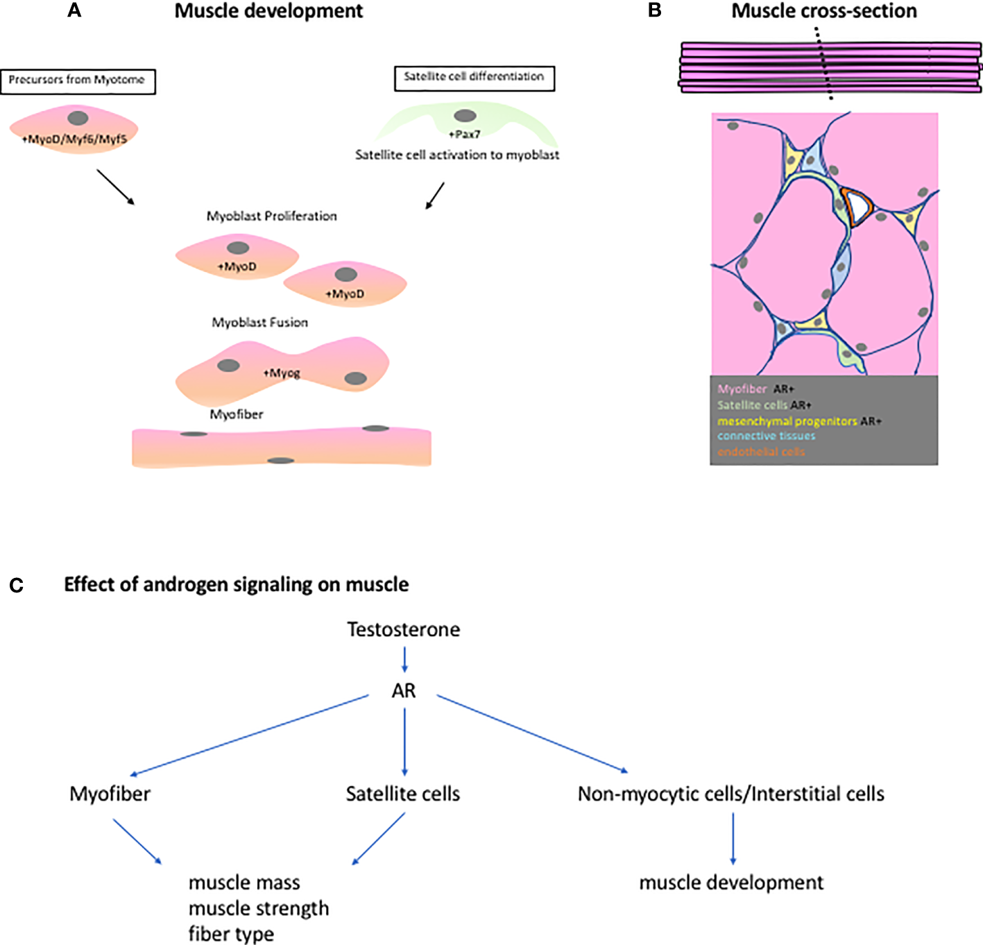 (A) Muscle embryonic development is highly regulated by the MRFs (Myf5, Myf6,MyoD and Myog). Precusor myoblast from the myotome travel to different parts of the body to establish the different muscle groups. These precursors or myoblast, expressing MyoD, will proliferate, fuse, and differentiate to form syncytial myofibers. During regeneration, the resident stem cells of the muscles, satellite cells, are activated and begin to express MyoD. It will then follow the same steps as in the embryonic muscle development. (B) A cross-section of the muscle shows the different cell population found in the muscles. Some of these cells express AR and are instrumental to the androgen-responsive nature of some muscle groups. (C) A scheme showing the effects of androgen signaling based on ArKO studies on different muscle groups.