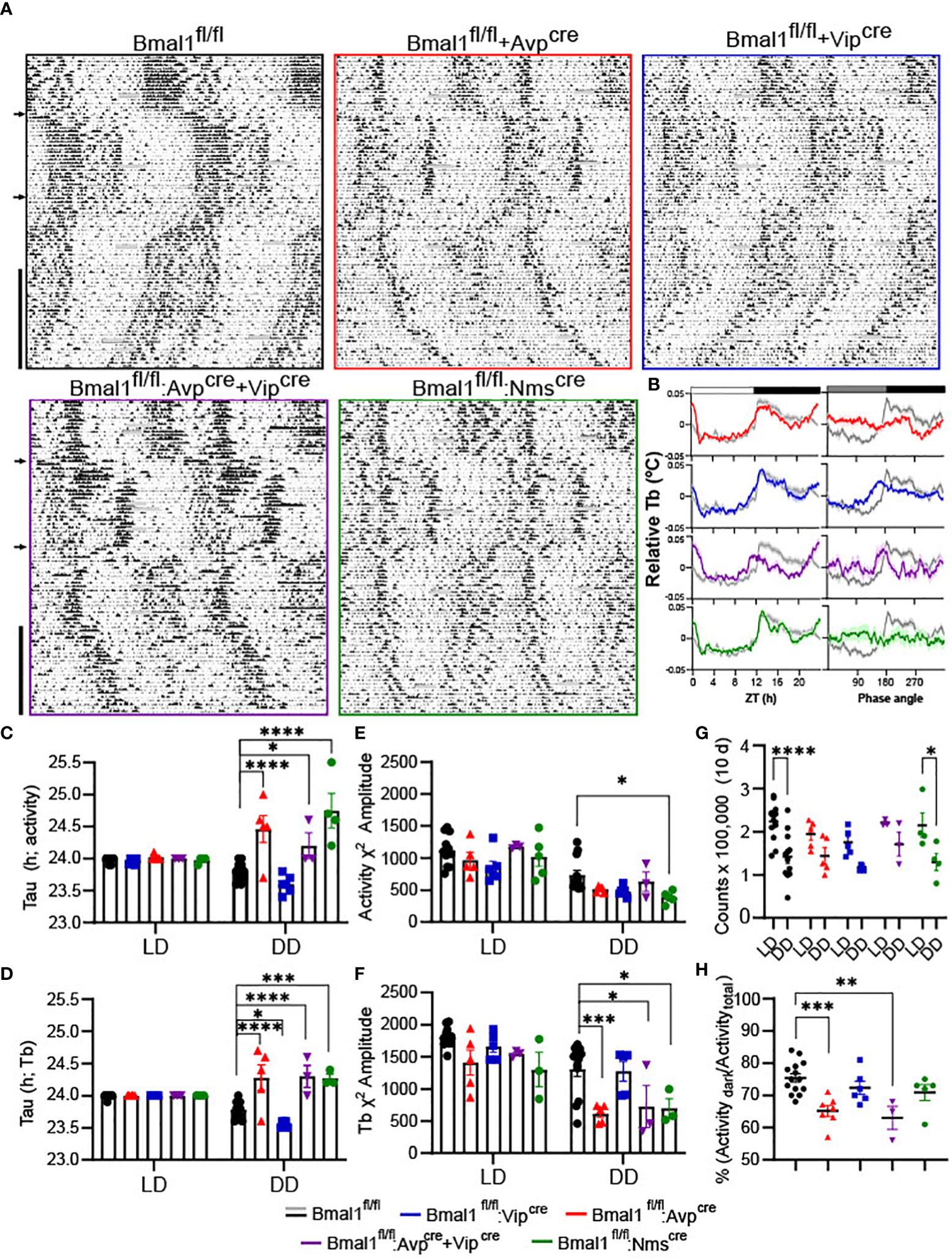 Conditional deletion of Bmal1 disrupts home cage activity and temperature rhythms. (A) Representative double-plotted, normalized actograms of male Bmal1fl/fl, Bmal1fl/fl:Avpcre, Bmal1fl/fl:Vipcre, Bmal1fl/fl:Avpcre+Vipcre, Bmal1fl/fl:Nmscre mice over a 16-week paradigm. Weeks 1-12 were spent in 12:12 LD, with 8-hour phase delays and advances occurring at week 4 and week 8 (arrows). At Week 12, animals were exposed to a 30 min light pulse (*) at ZT 20 and released into constant darkness for the remainder of the experiment (vertical black bar). Data during cage changes have been removed (gray boxes). (B) Body temperature (Tb) rhythms from a representative animal over 10 days in LD (left) and DD (right) compared to a representative Bmal1fl/fl (gray); data are plotted as mean ± SEM. (C, D) Free-running period (tau) from Chi-squared periodogram over the final 10 days of activity in the first LD period (LD) and constant darkness (DD) (C) or temperature (D) (n = 3-12). (E, F) Chi-squared periodogram amplitude from the same data as C and D for activity (E) and temperature (F). Data for tau and amplitude were analyzed by 2-way ANOVA and Dunnett’s multiple comparison test. (G) Total activity counts over 10 days in LD vs DD for all mutants (n = 3-12). Data were analyzed by 2-way ANOVA and Sidak’s multiple comparisons test. (H) Nocturnality was calculated as the percentage of the activity that occurred during the dark period compared to the total activity during the day for all mutants (n = 3-14). Data were analyzed by one-way ANOVA and Dunnett’s multiple comparison test. (*) p ≤ 0.05; (**) p ≤ 0.01; (***) p ≤ 0.001; (****) p ≤ 0.0001.