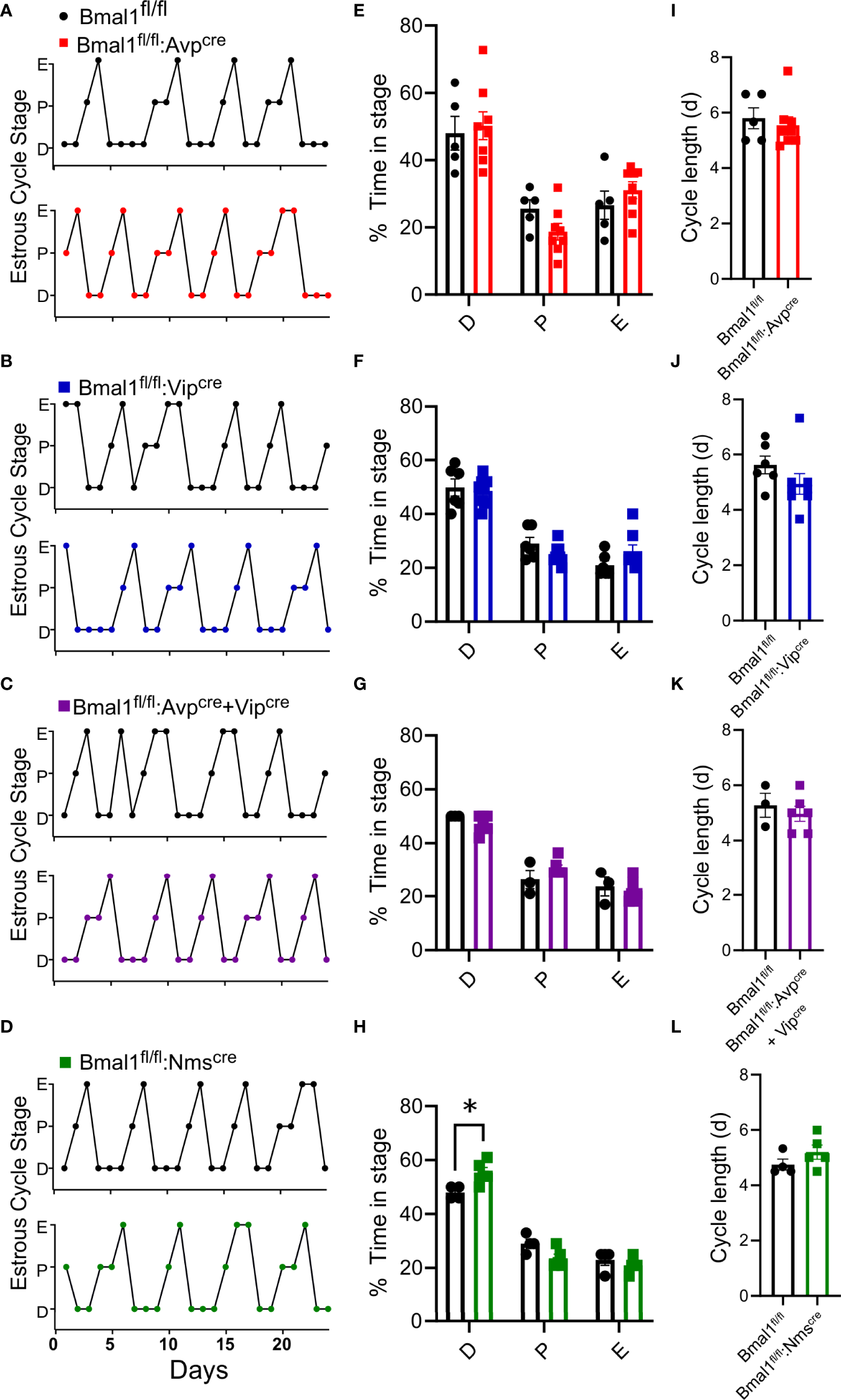 Loss of Bmal1 produces modest effects on estrous cyclicity in Bmal1fl/fl:Nmscre, but not other mutants. (A-D) Representative cycles over 24 days from Bmal1fl/fl:Avpcre, Bmal1fl/fl:Vipcre, Bmal1fl/fl:Avpcre+Vipcre, Bmal1fl/fl:Nmscre, with respective cohort Bmal1fl/fl control mice. Percentage time in each estrous stage, average cycle length for completed estrous cycles, and representative cycling graphs from in (E)Bmal1fl/fl:Avpcre (n = 5-8), (F)Bmal1fl/fl:Vipcre (n = 6-8) (G)Bmal1fl/fl:Avpcre+Vipcre (n = 3-6), and (H)Bmal1fl/fl:Nmscre (n = 4-5), analyzed by 2-way ANOVA and Sidak’s post hoc test. (I–L) Estrous cycle length (estrous to estrous) for each line, not significant by Student’s t-test. Significant values were (p ≤.05) are indicated by an asterisk (*).
