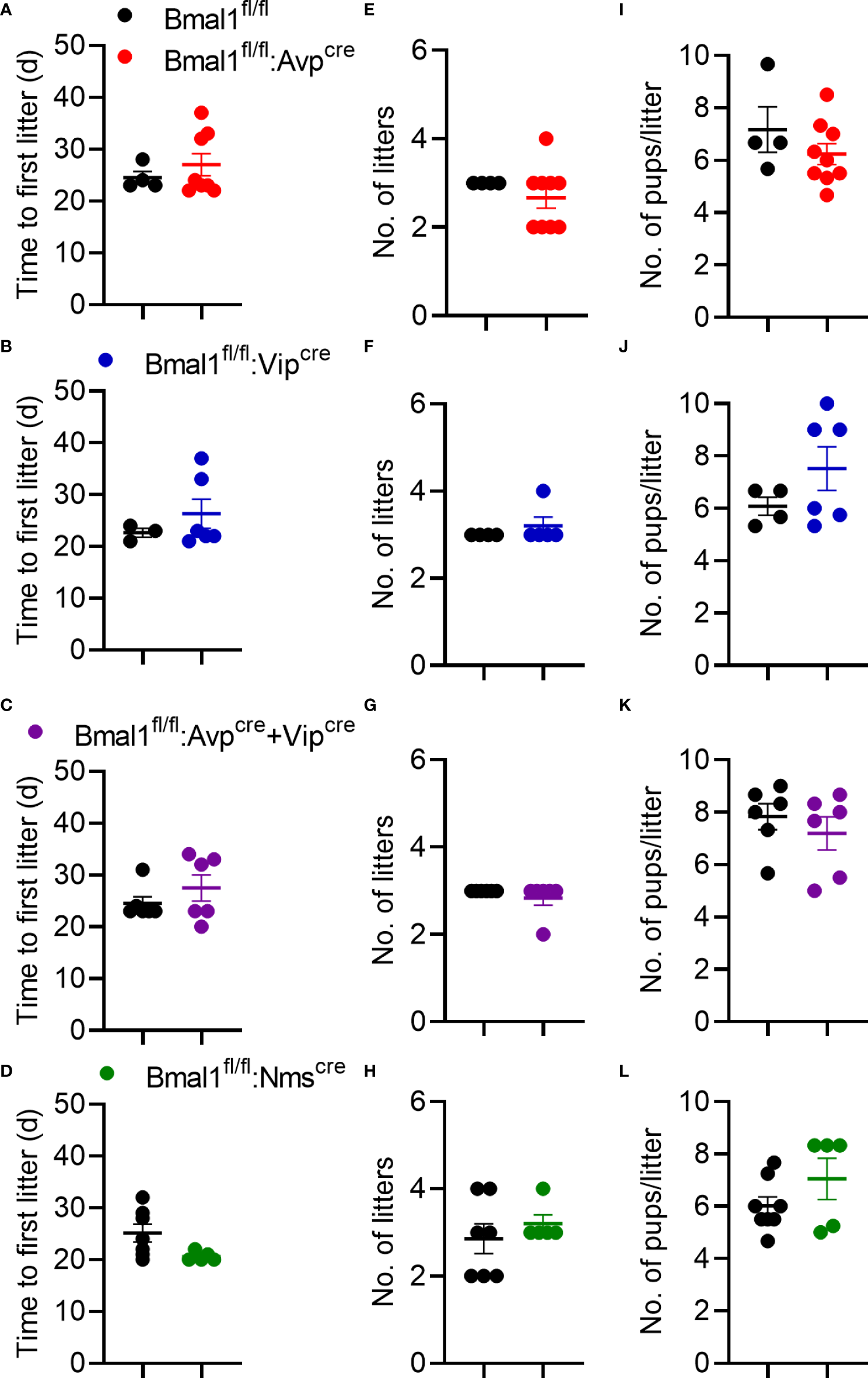 To determine if the mutant females had changes in fertility, we quantified the time to first litter, number of litters in 100 days, and size of litters. There was no significant difference in the time to first litter in any genotype compared to control (Figures 3A–D), although there was a trend towards fewer days to first litter in Bmal1fl/fl:Nmscre mice (Figure 3D, t-test; Bmal1fl/fl:Avpcre: 24.5 ± 1.1 vs 27.0 ± 2.1 days, n = 4-8, p = 0.4; Bmal1fl/fl:Vipcre: 22.7 ± 0.9 vs 22.3 ± 2.8 days, n = 3-6, p = 0.4; Bmal1fl/fl:Avpcre+Vipcre: 24.5 ± 1.3 vs 27.5 ± 2.5 days, n = 6, p = 0.3; Bmal1fl/fl:Nmscre: 25.14 ± 1.7 vs 20.6 ± 0.4 days, n = 5-7, p = 0.06). The number of litters in 100 days was not different among groups (Figures 3E–H, t-test; Bmal1fl/fl:Avpcre: 3.0 ± 0.0 vs 2.7 ± 0.2 litters, n = 4-9, p = 0.4; Bmal1fl/fl:Vipcre: 3.0 ± 0.0 vs 3.2 ± 0.2 litters, n = 4-5, p = 0.4; Bmal1fl/fl:Avpcre+Vipcre: 3.0 ± 0.0 vs 2.8 ± 0.2 litters, n = 6, p = 0.3; Bmal1fl/fl:Nmscre: 2.9 ± 0.3 vs 3.2 ± 0.2 litters, n = 5-7, p = 0.4). The number of pups per litter was also not different among the lines (Figures 3I–L, t-test; Bmal1fl/fl:Avpcre: 7.2 ± 0.9 vs 6.2 ± 0.4 pups, n = 4-9, p = 0.3; Bmal1fl/fl:Vipcre: 6.1 ± 0.3 vs 7.5 ± 0.8 pups, n = 4-6, p = 0.2; Bmal1fl/fl:Avpcre+Vipcre: 7.8 ± 0.5 vs 7.2 ± 0.6 pups, n = 6, p = 0.4; Bmal1fl/fl:Nmscre: 6.0 ± 0.4 vs 7.0 ± 0.8 pups, n = 5-8, p = 0.2). Overall, we observed no overt defects in reproductive capacity of these mice when housed on LD.